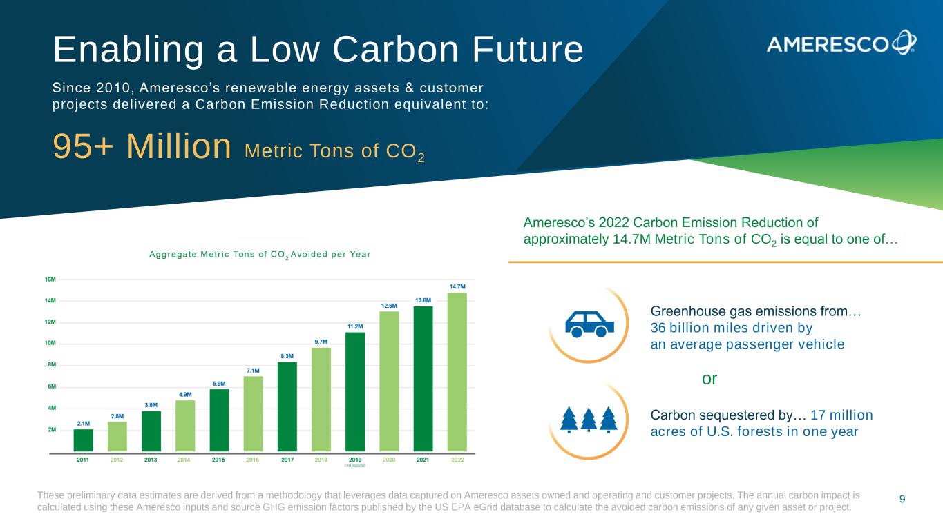 Enabling a Low Carbon Future Since 2010, Ameresco’s renewable energy assets & customer projects delivered a Carbon Emission Reduction equivalent to: Greenhouse gas emissions from… 36 billion miles driven by an average passenger vehicle Carbon sequestered by… 17 million acres of U.S. forests in one year or These preliminary data estimates are derived from a methodology that leverages data captured on Ameresco assets owned and operating and customer projects. The annual carbon impact is calculated using these Ameresco inputs and source GHG emission factors published by the US EPA eGrid database to calculate the avoided carbon emissions of any given asset or project. 95+ Million Metric Tons of CO2 Ameresco’s 2022 Carbon Emission Reduction of approximately 14.7M Metric Tons of CO2 is equal to one of… 9