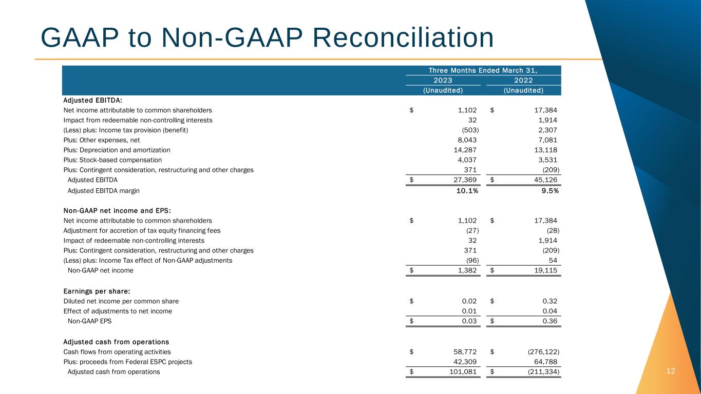 11 Non-GAAP Financial Measures We use the Non-GAAP financial measures defined and discussed below to provide investors and others with useful supplemental information to our financial results prepared in accordance with GAAP. These Non-GAAP financial measures should not be considered as an alternative to any measure of financial performance calculated and presented in accordance with GAAP. For a reconciliation of these Non-GAAP measures to the most directly comparable financial measures prepared in accordance with GAAP, please see the table at the end of this presentation titled “GAAP to Non-GAAP Reconciliation.” We understand that, although measures similar to these Non- GAAP financial measures are frequently used by investors and securities analysts in their evaluation of companies, they have limitations as analytical tools, and investors should not consider them in isolation or as a substitute for the most directly comparable GAAP financial measures or an analysis of our results of operations as reported under GAAP. To properly and prudently evaluate our business, we encourage investors to review our GAAP financial statements and not to rely on any single financial measure to evaluate our business. Adjusted EBITDA and Adjusted EBITDA Margin We define adjusted EBITDA as net income attributable to common shareholders, including impact from redeemable non-controlling interests, before income tax (benefit) provision, other expenses net, depreciation, amortization of intangible assets, accretion of asset retirement obligations, contingent consideration expense, stock-based compensation expense, energy asset impairment, restructuring and other charges, gain or loss on sale of equity investment, and gain or loss upon deconsolidation of a variable interest entity. We believe adjusted EBITDA is useful to investors in evaluating our operating performance for the following reasons: adjusted EBITDA and similar Non-GAAP measures are widely used by investors to measure a company's operating performance without regard to items that can vary substantially from company to company depending upon financing and accounting methods, book values of assets, capital structures and the methods by which assets were acquired; securities analysts often use adjusted EBITDA and similar Non-GAAP measures as supplemental measures to evaluate the overall operating performance of companies; and by comparing our adjusted EBITDA in different historical periods, investors can evaluate our operating results without the additional variations of depreciation and amortization expense, accretion of asset retirement obligations, contingent consideration expense, stock-based compensation expense, impact from redeemable non-controlling interests, restructuring and asset impairment charges. We define adjusted EBITDA margin as adjusted EBITDA stated as a percentage of revenue. Our management uses adjusted EBITDA and adjusted EBITDA margin as measures of operating performance, because they do not include the impact of items that we do not consider indicative of our core operating performance; for planning purposes, including the preparation of our annual operating budget; to allocate resources to enhance the financial performance of the business; to evaluate the effectiveness of our business strategies; and in communications with the board of directors and investors concerning our financial performance. Non-GAAP Net Income and EPS We define Non-GAAP net income and earnings per share (EPS) to exclude certain discrete items that management does not consider representative of our ongoing operations, including energy asset impairment, restructuring and other charges, impact from redeemable non-controlling interest, gain or loss on sale of equity investment, and gain or loss upon deconsolidation of a variable interest entity. We consider Non-GAAP net income and Non- GAAP EPS to be important indicators of our operational strength and performance of our business because they eliminate the effects of events that are not part of the Company's core operations. Adjusted Cash from Operations We define adjusted cash from operations as cash flows from operating activities plus proceeds from Federal ESPC projects. Cash received in payment of Federal ESPC projects is treated as a financing cash flow under GAAP due to the unusual financing structure for these projects. These cash flows, however, correspond to the revenue generated by these projects. Thus we believe that adjusting operating cash flow to include the cash generated by our Federal ESPC projects provides investors with a useful measure for evaluating the cash generating ability of our core operating business. Our management uses adjusted cash from operations as a measure of liquidity because it captures all sources of cash associated with our revenue generated by operations.