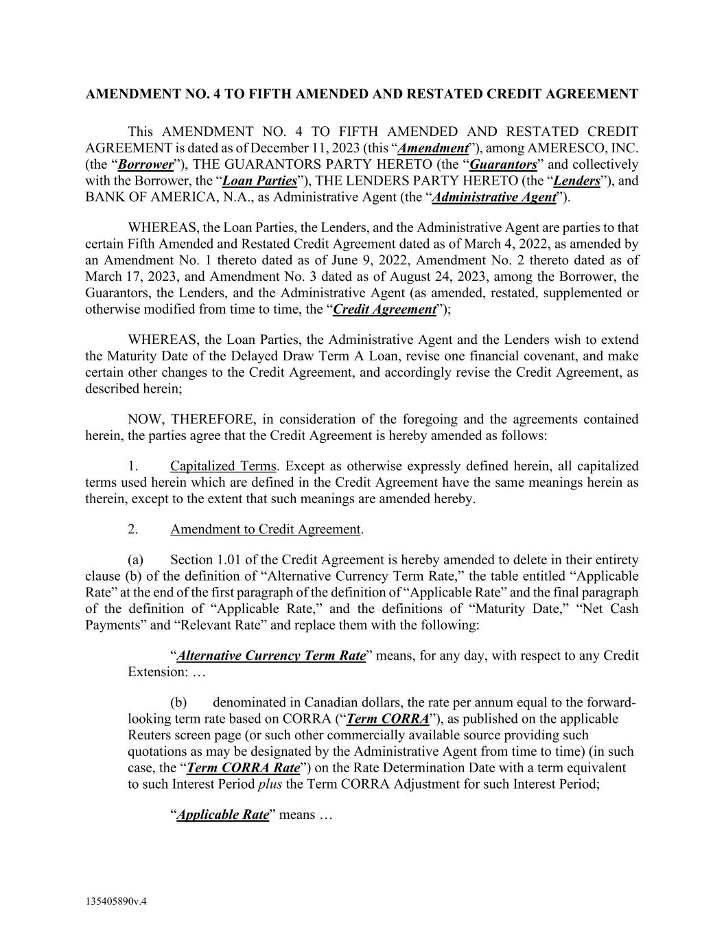 AMENDMENT NO. 4 TO FIFTH AMENDED AND RESTATED CREDIT AGREEMENT This AMENDMENT NO. 4 TO FIFTH AMENDED AND RESTATED CREDIT AGREEMENT is dated as of December 11, 2023 (this “Amendment”), among AMERESCO, INC. (the “Borrower”), THE GUARANTORS PARTY HERETO (the “Guarantors” and collectively with the Borrower, the “Loan Parties”), THE LENDERS PARTY HERETO (the “Lenders”), and BANK OF AMERICA, N.A., as Administrative Agent (the “Administrative Agent”). WHEREAS, the Loan Parties, the Lenders, and the Administrative Agent are parties to that certain Fifth Amended and Restated Credit Agreement dated as of March 4, 2022, as amended by an Amendment No. 1 thereto dated as of June 9, 2022, Amendment No. 2 thereto dated as of March 17, 2023, and Amendment No. 3 dated as of August 24, 2023, among the Borrower, the Guarantors, the Lenders, and the Administrative Agent (as amended, restated, supplemented or otherwise modified from time to time, the “Credit Agreement”); WHEREAS, the Loan Parties, the Administrative Agent and the Lenders wish to extend the Maturity Date of the Delayed Draw Term A Loan, revise one financial covenant, and make certain other changes to the Credit Agreement, and accordingly revise the Credit Agreement, as described herein; NOW, THEREFORE, in consideration of the foregoing and the agreements contained herein, the parties agree that the Credit Agreement is hereby amended as follows: 1. Capitalized Terms. Except as otherwise expressly defined herein, all capitalized terms used herein which are defined in the Credit Agreement have the same meanings herein as therein, except to the extent that such meanings are amended hereby. 2. Amendment to Credit Agreement. (a) Section 1.01 of the Credit Agreement is hereby amended to delete in their entirety clause (b) of the definition of “Alternative Currency Term Rate,” the table entitled “Applicable Rate” at the end of the first paragraph of the definition of “Applicable Rate” and the final paragraph of the definition of “Applicable Rate,” and the definitions of “Maturity Date,” “Net Cash Payments” and “Relevant Rate” and replace them with the following: “Alternative Currency Term Rate” means, for any day, with respect to any Credit Extension: … (b) denominated in Canadian dollars, the rate per annum equal to the forward- looking term rate based on CORRA (“Term CORRA”), as published on the applicable Reuters screen page (or such other commercially available source providing such quotations as may be designated by the Administrative Agent from time to time) (in such case, the “Term CORRA Rate”) on the Rate Determination Date with a term equivalent to such Interest Period plus the Term CORRA Adjustment for such Interest Period; “Applicable Rate” means … 135405890v.4