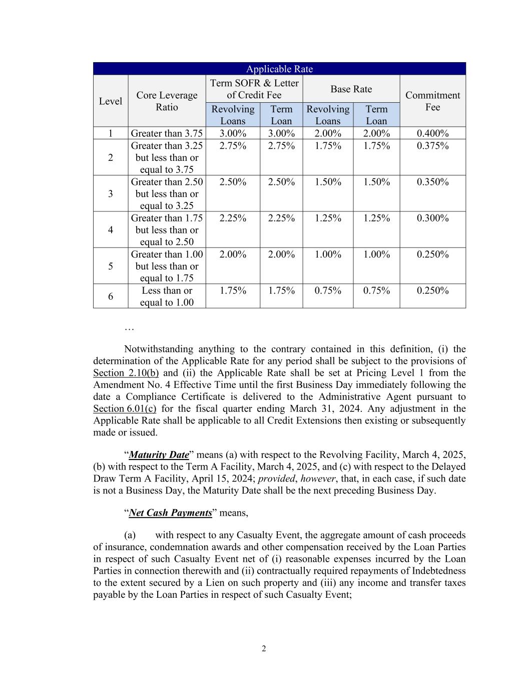 2 Applicable Rate Level Core Leverage Ratio Term SOFR & Letter of Credit Fee Base Rate Commitment Fee Revolving Loans Term Loan Revolving Loans Term Loan 1 Greater than 3.75 3.00% 3.00% 2.00% 2.00% 0.400% 2 Greater than 3.25 but less than or equal to 3.75 2.75% 2.75% 1.75% 1.75% 0.375% 3 Greater than 2.50 but less than or equal to 3.25 2.50% 2.50% 1.50% 1.50% 0.350% 4 Greater than 1.75 but less than or equal to 2.50 2.25% 2.25% 1.25% 1.25% 0.300% 5 Greater than 1.00 but less than or equal to 1.75 2.00% 2.00% 1.00% 1.00% 0.250% 6 Less than or equal to 1.00 1.75% 1.75% 0.75% 0.75% 0.250% … Notwithstanding anything to the contrary contained in this definition, (i) the determination of the Applicable Rate for any period shall be subject to the provisions of Section 2.10(b) and (ii) the Applicable Rate shall be set at Pricing Level 1 from the Amendment No. 4 Effective Time until the first Business Day immediately following the date a Compliance Certificate is delivered to the Administrative Agent pursuant to Section 6.01(c) for the fiscal quarter ending March 31, 2024. Any adjustment in the Applicable Rate shall be applicable to all Credit Extensions then existing or subsequently made or issued. “Maturity Date” means (a) with respect to the Revolving Facility, March 4, 2025, (b) with respect to the Term A Facility, March 4, 2025, and (c) with respect to the Delayed Draw Term A Facility, April 15, 2024; provided, however, that, in each case, if such date is not a Business Day, the Maturity Date shall be the next preceding Business Day. “Net Cash Payments” means, (a) with respect to any Casualty Event, the aggregate amount of cash proceeds of insurance, condemnation awards and other compensation received by the Loan Parties in respect of such Casualty Event net of (i) reasonable expenses incurred by the Loan Parties in connection therewith and (ii) contractually required repayments of Indebtedness to the extent secured by a Lien on such property and (iii) any income and transfer taxes payable by the Loan Parties in respect of such Casualty Event;