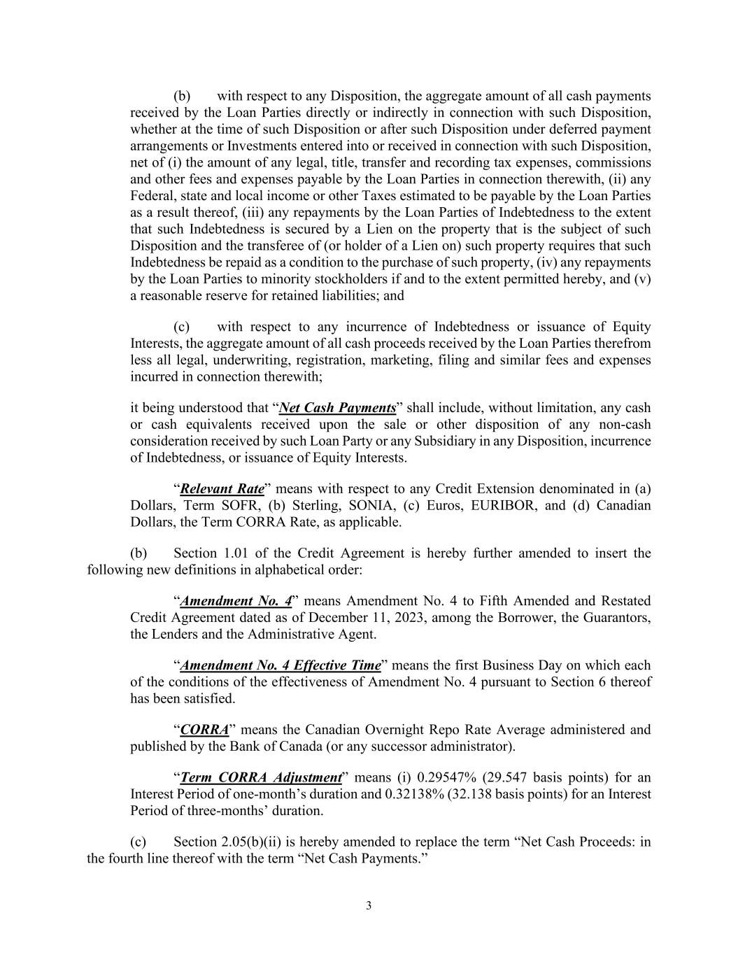 3 (b) with respect to any Disposition, the aggregate amount of all cash payments received by the Loan Parties directly or indirectly in connection with such Disposition, whether at the time of such Disposition or after such Disposition under deferred payment arrangements or Investments entered into or received in connection with such Disposition, net of (i) the amount of any legal, title, transfer and recording tax expenses, commissions and other fees and expenses payable by the Loan Parties in connection therewith, (ii) any Federal, state and local income or other Taxes estimated to be payable by the Loan Parties as a result thereof, (iii) any repayments by the Loan Parties of Indebtedness to the extent that such Indebtedness is secured by a Lien on the property that is the subject of such Disposition and the transferee of (or holder of a Lien on) such property requires that such Indebtedness be repaid as a condition to the purchase of such property, (iv) any repayments by the Loan Parties to minority stockholders if and to the extent permitted hereby, and (v) a reasonable reserve for retained liabilities; and (c) with respect to any incurrence of Indebtedness or issuance of Equity Interests, the aggregate amount of all cash proceeds received by the Loan Parties therefrom less all legal, underwriting, registration, marketing, filing and similar fees and expenses incurred in connection therewith; it being understood that “Net Cash Payments” shall include, without limitation, any cash or cash equivalents received upon the sale or other disposition of any non-cash consideration received by such Loan Party or any Subsidiary in any Disposition, incurrence of Indebtedness, or issuance of Equity Interests. “Relevant Rate” means with respect to any Credit Extension denominated in (a) Dollars, Term SOFR, (b) Sterling, SONIA, (c) Euros, EURIBOR, and (d) Canadian Dollars, the Term CORRA Rate, as applicable. (b) Section 1.01 of the Credit Agreement is hereby further amended to insert the following new definitions in alphabetical order: “Amendment No. 4” means Amendment No. 4 to Fifth Amended and Restated Credit Agreement dated as of December 11, 2023, among the Borrower, the Guarantors, the Lenders and the Administrative Agent. “Amendment No. 4 Effective Time” means the first Business Day on which each of the conditions of the effectiveness of Amendment No. 4 pursuant to Section 6 thereof has been satisfied. “CORRA” means the Canadian Overnight Repo Rate Average administered and published by the Bank of Canada (or any successor administrator). “Term CORRA Adjustment” means (i) 0.29547% (29.547 basis points) for an Interest Period of one-month’s duration and 0.32138% (32.138 basis points) for an Interest Period of three-months’ duration. (c) Section 2.05(b)(ii) is hereby amended to replace the term “Net Cash Proceeds: in the fourth line thereof with the term “Net Cash Payments.”