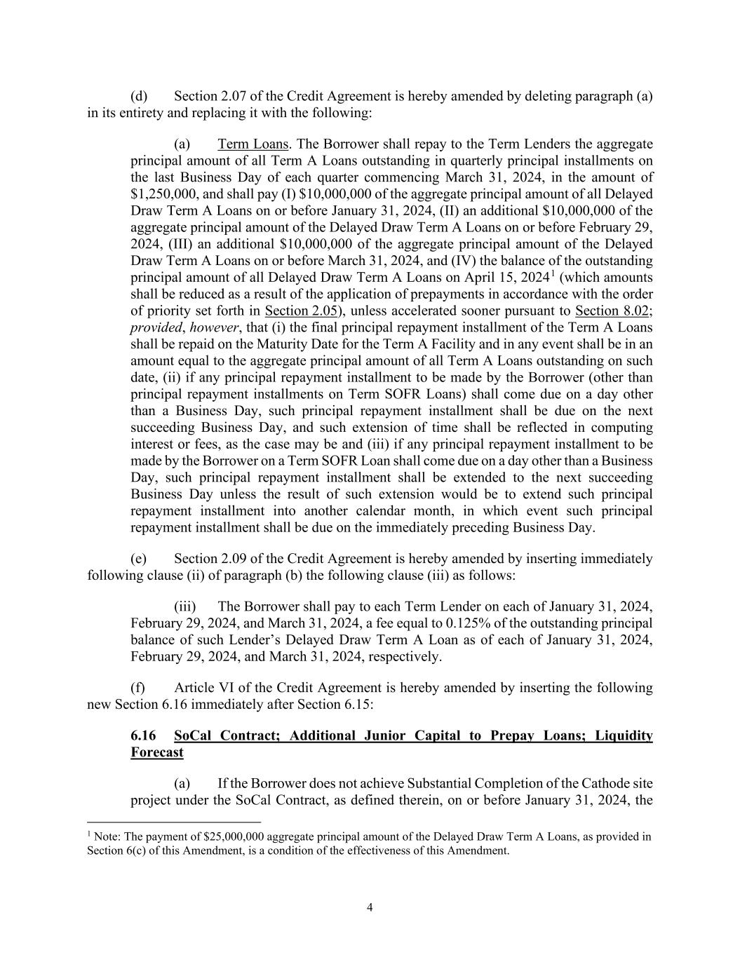 4 (d) Section 2.07 of the Credit Agreement is hereby amended by deleting paragraph (a) in its entirety and replacing it with the following: (a) Term Loans. The Borrower shall repay to the Term Lenders the aggregate principal amount of all Term A Loans outstanding in quarterly principal installments on the last Business Day of each quarter commencing March 31, 2024, in the amount of $1,250,000, and shall pay (I) $10,000,000 of the aggregate principal amount of all Delayed Draw Term A Loans on or before January 31, 2024, (II) an additional $10,000,000 of the aggregate principal amount of the Delayed Draw Term A Loans on or before February 29, 2024, (III) an additional $10,000,000 of the aggregate principal amount of the Delayed Draw Term A Loans on or before March 31, 2024, and (IV) the balance of the outstanding principal amount of all Delayed Draw Term A Loans on April 15, 20241 (which amounts shall be reduced as a result of the application of prepayments in accordance with the order of priority set forth in Section 2.05), unless accelerated sooner pursuant to Section 8.02; provided, however, that (i) the final principal repayment installment of the Term A Loans shall be repaid on the Maturity Date for the Term A Facility and in any event shall be in an amount equal to the aggregate principal amount of all Term A Loans outstanding on such date, (ii) if any principal repayment installment to be made by the Borrower (other than principal repayment installments on Term SOFR Loans) shall come due on a day other than a Business Day, such principal repayment installment shall be due on the next succeeding Business Day, and such extension of time shall be reflected in computing interest or fees, as the case may be and (iii) if any principal repayment installment to be made by the Borrower on a Term SOFR Loan shall come due on a day other than a Business Day, such principal repayment installment shall be extended to the next succeeding Business Day unless the result of such extension would be to extend such principal repayment installment into another calendar month, in which event such principal repayment installment shall be due on the immediately preceding Business Day. (e) Section 2.09 of the Credit Agreement is hereby amended by inserting immediately following clause (ii) of paragraph (b) the following clause (iii) as follows: (iii) The Borrower shall pay to each Term Lender on each of January 31, 2024, February 29, 2024, and March 31, 2024, a fee equal to 0.125% of the outstanding principal balance of such Lender’s Delayed Draw Term A Loan as of each of January 31, 2024, February 29, 2024, and March 31, 2024, respectively. (f) Article VI of the Credit Agreement is hereby amended by inserting the following new Section 6.16 immediately after Section 6.15: 6.16 SoCal Contract; Additional Junior Capital to Prepay Loans; Liquidity Forecast (a) If the Borrower does not achieve Substantial Completion of the Cathode site project under the SoCal Contract, as defined therein, on or before January 31, 2024, the 1 Note: The payment of $25,000,000 aggregate principal amount of the Delayed Draw Term A Loans, as provided in Section 6(c) of this Amendment, is a condition of the effectiveness of this Amendment.