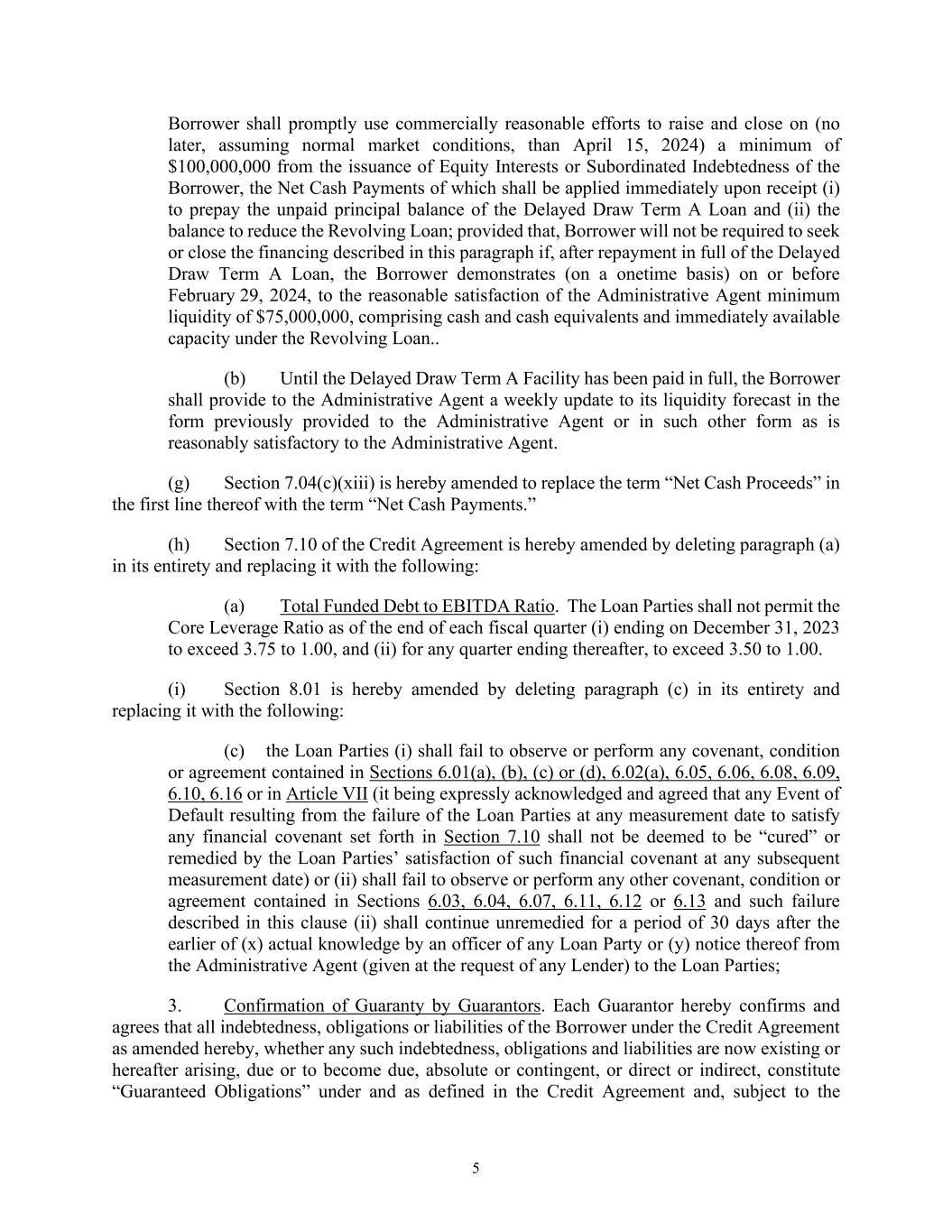 5 Borrower shall promptly use commercially reasonable efforts to raise and close on (no later, assuming normal market conditions, than April 15, 2024) a minimum of $100,000,000 from the issuance of Equity Interests or Subordinated Indebtedness of the Borrower, the Net Cash Payments of which shall be applied immediately upon receipt (i) to prepay the unpaid principal balance of the Delayed Draw Term A Loan and (ii) the balance to reduce the Revolving Loan; provided that, Borrower will not be required to seek or close the financing described in this paragraph if, after repayment in full of the Delayed Draw Term A Loan, the Borrower demonstrates (on a onetime basis) on or before February 29, 2024, to the reasonable satisfaction of the Administrative Agent minimum liquidity of $75,000,000, comprising cash and cash equivalents and immediately available capacity under the Revolving Loan.. (b) Until the Delayed Draw Term A Facility has been paid in full, the Borrower shall provide to the Administrative Agent a weekly update to its liquidity forecast in the form previously provided to the Administrative Agent or in such other form as is reasonably satisfactory to the Administrative Agent. (g) Section 7.04(c)(xiii) is hereby amended to replace the term “Net Cash Proceeds” in the first line thereof with the term “Net Cash Payments.” (h) Section 7.10 of the Credit Agreement is hereby amended by deleting paragraph (a) in its entirety and replacing it with the following: (a) Total Funded Debt to EBITDA Ratio. The Loan Parties shall not permit the Core Leverage Ratio as of the end of each fiscal quarter (i) ending on December 31, 2023 to exceed 3.75 to 1.00, and (ii) for any quarter ending thereafter, to exceed 3.50 to 1.00. (i) Section 8.01 is hereby amended by deleting paragraph (c) in its entirety and replacing it with the following: (c) the Loan Parties (i) shall fail to observe or perform any covenant, condition or agreement contained in Sections 6.01(a), (b), (c) or (d), 6.02(a), 6.05, 6.06, 6.08, 6.09, 6.10, 6.16 or in Article VII (it being expressly acknowledged and agreed that any Event of Default resulting from the failure of the Loan Parties at any measurement date to satisfy any financial covenant set forth in Section 7.10 shall not be deemed to be “cured” or remedied by the Loan Parties’ satisfaction of such financial covenant at any subsequent measurement date) or (ii) shall fail to observe or perform any other covenant, condition or agreement contained in Sections 6.03, 6.04, 6.07, 6.11, 6.12 or 6.13 and such failure described in this clause (ii) shall continue unremedied for a period of 30 days after the earlier of (x) actual knowledge by an officer of any Loan Party or (y) notice thereof from the Administrative Agent (given at the request of any Lender) to the Loan Parties; 3. Confirmation of Guaranty by Guarantors. Each Guarantor hereby confirms and agrees that all indebtedness, obligations or liabilities of the Borrower under the Credit Agreement as amended hereby, whether any such indebtedness, obligations and liabilities are now existing or hereafter arising, due or to become due, absolute or contingent, or direct or indirect, constitute “Guaranteed Obligations” under and as defined in the Credit Agreement and, subject to the