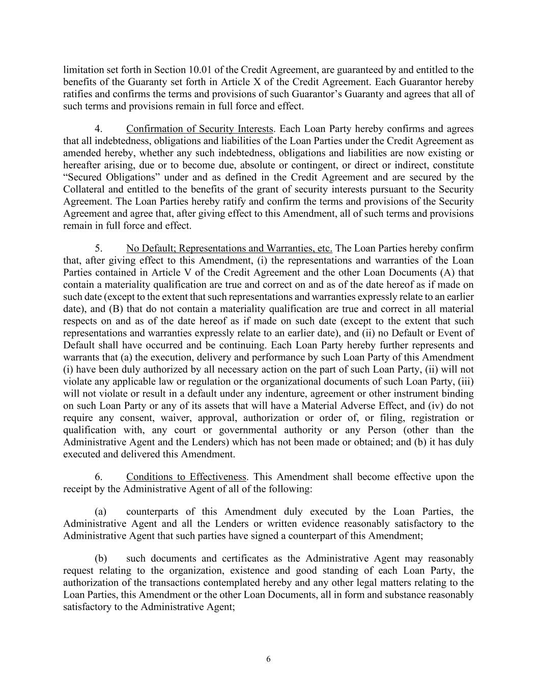 6 limitation set forth in Section 10.01 of the Credit Agreement, are guaranteed by and entitled to the benefits of the Guaranty set forth in Article X of the Credit Agreement. Each Guarantor hereby ratifies and confirms the terms and provisions of such Guarantor’s Guaranty and agrees that all of such terms and provisions remain in full force and effect. 4. Confirmation of Security Interests. Each Loan Party hereby confirms and agrees that all indebtedness, obligations and liabilities of the Loan Parties under the Credit Agreement as amended hereby, whether any such indebtedness, obligations and liabilities are now existing or hereafter arising, due or to become due, absolute or contingent, or direct or indirect, constitute “Secured Obligations” under and as defined in the Credit Agreement and are secured by the Collateral and entitled to the benefits of the grant of security interests pursuant to the Security Agreement. The Loan Parties hereby ratify and confirm the terms and provisions of the Security Agreement and agree that, after giving effect to this Amendment, all of such terms and provisions remain in full force and effect. 5. No Default; Representations and Warranties, etc. The Loan Parties hereby confirm that, after giving effect to this Amendment, (i) the representations and warranties of the Loan Parties contained in Article V of the Credit Agreement and the other Loan Documents (A) that contain a materiality qualification are true and correct on and as of the date hereof as if made on such date (except to the extent that such representations and warranties expressly relate to an earlier date), and (B) that do not contain a materiality qualification are true and correct in all material respects on and as of the date hereof as if made on such date (except to the extent that such representations and warranties expressly relate to an earlier date), and (ii) no Default or Event of Default shall have occurred and be continuing. Each Loan Party hereby further represents and warrants that (a) the execution, delivery and performance by such Loan Party of this Amendment (i) have been duly authorized by all necessary action on the part of such Loan Party, (ii) will not violate any applicable law or regulation or the organizational documents of such Loan Party, (iii) will not violate or result in a default under any indenture, agreement or other instrument binding on such Loan Party or any of its assets that will have a Material Adverse Effect, and (iv) do not require any consent, waiver, approval, authorization or order of, or filing, registration or qualification with, any court or governmental authority or any Person (other than the Administrative Agent and the Lenders) which has not been made or obtained; and (b) it has duly executed and delivered this Amendment. 6. Conditions to Effectiveness. This Amendment shall become effective upon the receipt by the Administrative Agent of all of the following: (a) counterparts of this Amendment duly executed by the Loan Parties, the Administrative Agent and all the Lenders or written evidence reasonably satisfactory to the Administrative Agent that such parties have signed a counterpart of this Amendment; (b) such documents and certificates as the Administrative Agent may reasonably request relating to the organization, existence and good standing of each Loan Party, the authorization of the transactions contemplated hereby and any other legal matters relating to the Loan Parties, this Amendment or the other Loan Documents, all in form and substance reasonably satisfactory to the Administrative Agent;