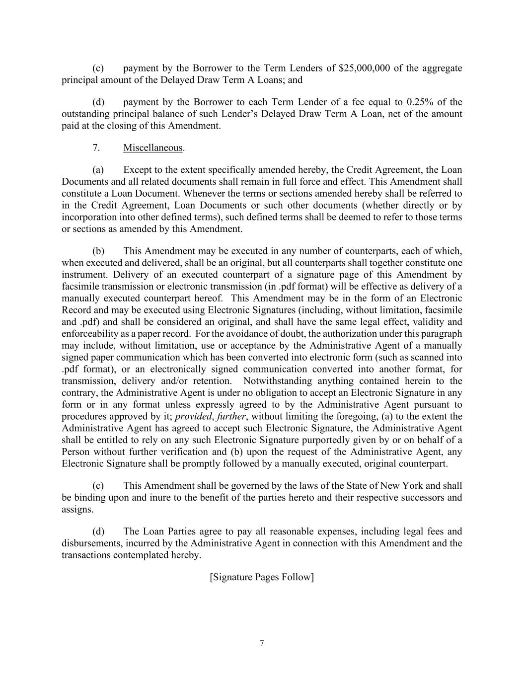 7 (c) payment by the Borrower to the Term Lenders of $25,000,000 of the aggregate principal amount of the Delayed Draw Term A Loans; and (d) payment by the Borrower to each Term Lender of a fee equal to 0.25% of the outstanding principal balance of such Lender’s Delayed Draw Term A Loan, net of the amount paid at the closing of this Amendment. 7. Miscellaneous. (a) Except to the extent specifically amended hereby, the Credit Agreement, the Loan Documents and all related documents shall remain in full force and effect. This Amendment shall constitute a Loan Document. Whenever the terms or sections amended hereby shall be referred to in the Credit Agreement, Loan Documents or such other documents (whether directly or by incorporation into other defined terms), such defined terms shall be deemed to refer to those terms or sections as amended by this Amendment. (b) This Amendment may be executed in any number of counterparts, each of which, when executed and delivered, shall be an original, but all counterparts shall together constitute one instrument. Delivery of an executed counterpart of a signature page of this Amendment by facsimile transmission or electronic transmission (in .pdf format) will be effective as delivery of a manually executed counterpart hereof. This Amendment may be in the form of an Electronic Record and may be executed using Electronic Signatures (including, without limitation, facsimile and .pdf) and shall be considered an original, and shall have the same legal effect, validity and enforceability as a paper record. For the avoidance of doubt, the authorization under this paragraph may include, without limitation, use or acceptance by the Administrative Agent of a manually signed paper communication which has been converted into electronic form (such as scanned into .pdf format), or an electronically signed communication converted into another format, for transmission, delivery and/or retention. Notwithstanding anything contained herein to the contrary, the Administrative Agent is under no obligation to accept an Electronic Signature in any form or in any format unless expressly agreed to by the Administrative Agent pursuant to procedures approved by it; provided, further, without limiting the foregoing, (a) to the extent the Administrative Agent has agreed to accept such Electronic Signature, the Administrative Agent shall be entitled to rely on any such Electronic Signature purportedly given by or on behalf of a Person without further verification and (b) upon the request of the Administrative Agent, any Electronic Signature shall be promptly followed by a manually executed, original counterpart. (c) This Amendment shall be governed by the laws of the State of New York and shall be binding upon and inure to the benefit of the parties hereto and their respective successors and assigns. (d) The Loan Parties agree to pay all reasonable expenses, including legal fees and disbursements, incurred by the Administrative Agent in connection with this Amendment and the transactions contemplated hereby. [Signature Pages Follow]