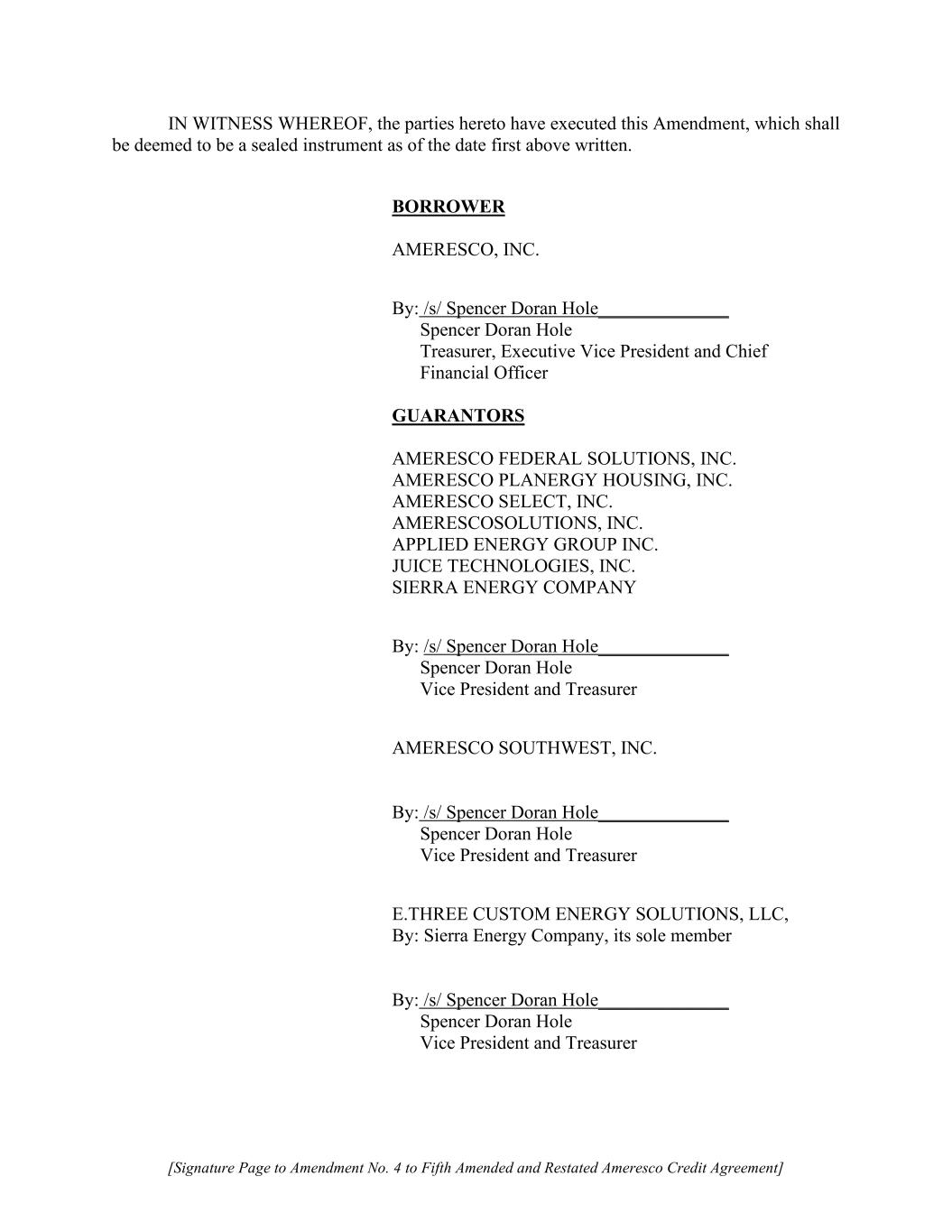 [Signature Page to Amendment No. 4 to Fifth Amended and Restated Ameresco Credit Agreement] IN WITNESS WHEREOF, the parties hereto have executed this Amendment, which shall be deemed to be a sealed instrument as of the date first above written. BORROWER AMERESCO, INC. By: /s/ Spencer Doran Hole______________ Spencer Doran Hole Treasurer, Executive Vice President and Chief Financial Officer GUARANTORS AMERESCO FEDERAL SOLUTIONS, INC. AMERESCO PLANERGY HOUSING, INC. AMERESCO SELECT, INC. AMERESCOSOLUTIONS, INC. APPLIED ENERGY GROUP INC. JUICE TECHNOLOGIES, INC. SIERRA ENERGY COMPANY By: /s/ Spencer Doran Hole______________ Spencer Doran Hole Vice President and Treasurer AMERESCO SOUTHWEST, INC. By: /s/ Spencer Doran Hole______________ Spencer Doran Hole Vice President and Treasurer E.THREE CUSTOM ENERGY SOLUTIONS, LLC, By: Sierra Energy Company, its sole member By: /s/ Spencer Doran Hole______________ Spencer Doran Hole Vice President and Treasurer