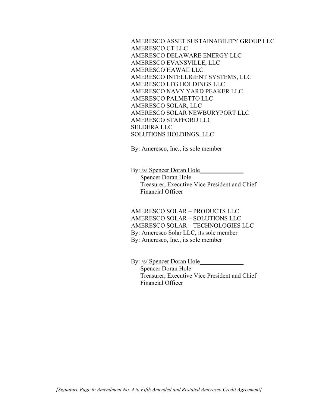 [Signature Page to Amendment No. 4 to Fifth Amended and Restated Ameresco Credit Agreement] AMERESCO ASSET SUSTAINABILITY GROUP LLC AMERESCO CT LLC AMERESCO DELAWARE ENERGY LLC AMERESCO EVANSVILLE, LLC AMERESCO HAWAII LLC AMERESCO INTELLIGENT SYSTEMS, LLC AMERESCO LFG HOLDINGS LLC AMERESCO NAVY YARD PEAKER LLC AMERESCO PALMETTO LLC AMERESCO SOLAR, LLC AMERESCO SOLAR NEWBURYPORT LLC AMERESCO STAFFORD LLC SELDERA LLC SOLUTIONS HOLDINGS, LLC By: Ameresco, Inc., its sole member By: /s/ Spencer Doran Hole______________ Spencer Doran Hole Treasurer, Executive Vice President and Chief Financial Officer AMERESCO SOLAR – PRODUCTS LLC AMERESCO SOLAR – SOLUTIONS LLC AMERESCO SOLAR – TECHNOLOGIES LLC By: Ameresco Solar LLC, its sole member By: Ameresco, Inc., its sole member By: /s/ Spencer Doran Hole______________ Spencer Doran Hole Treasurer, Executive Vice President and Chief Financial Officer