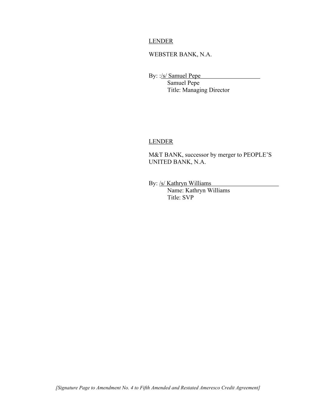 [Signature Page to Amendment No. 4 to Fifth Amended and Restated Ameresco Credit Agreement] LENDER WEBSTER BANK, N.A. By: :/s/ Samuel Pepe Samuel Pepe Title: Managing Director LENDER M&T BANK, successor by merger to PEOPLE’S UNITED BANK, N.A. By: /s/ Kathryn Williams Name: Kathryn Williams Title: SVP