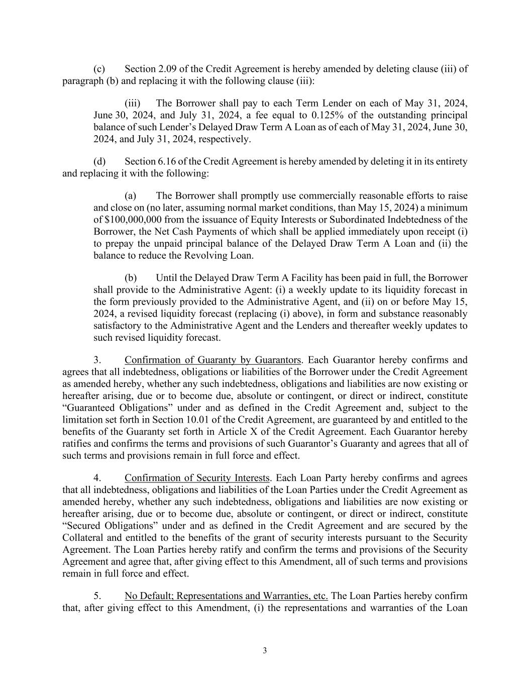 3 (c) Section 2.09 of the Credit Agreement is hereby amended by deleting clause (iii) of paragraph (b) and replacing it with the following clause (iii): (iii) The Borrower shall pay to each Term Lender on each of May 31, 2024, June 30, 2024, and July 31, 2024, a fee equal to 0.125% of the outstanding principal balance of such Lender’s Delayed Draw Term A Loan as of each of May 31, 2024, June 30, 2024, and July 31, 2024, respectively. (d) Section 6.16 of the Credit Agreement is hereby amended by deleting it in its entirety and replacing it with the following: (a) The Borrower shall promptly use commercially reasonable efforts to raise and close on (no later, assuming normal market conditions, than May 15, 2024) a minimum of $100,000,000 from the issuance of Equity Interests or Subordinated Indebtedness of the Borrower, the Net Cash Payments of which shall be applied immediately upon receipt (i) to prepay the unpaid principal balance of the Delayed Draw Term A Loan and (ii) the balance to reduce the Revolving Loan. (b) Until the Delayed Draw Term A Facility has been paid in full, the Borrower shall provide to the Administrative Agent: (i) a weekly update to its liquidity forecast in the form previously provided to the Administrative Agent, and (ii) on or before May 15, 2024, a revised liquidity forecast (replacing (i) above), in form and substance reasonably satisfactory to the Administrative Agent and the Lenders and thereafter weekly updates to such revised liquidity forecast. 3. Confirmation of Guaranty by Guarantors. Each Guarantor hereby confirms and agrees that all indebtedness, obligations or liabilities of the Borrower under the Credit Agreement as amended hereby, whether any such indebtedness, obligations and liabilities are now existing or hereafter arising, due or to become due, absolute or contingent, or direct or indirect, constitute “Guaranteed Obligations” under and as defined in the Credit Agreement and, subject to the limitation set forth in Section 10.01 of the Credit Agreement, are guaranteed by and entitled to the benefits of the Guaranty set forth in Article X of the Credit Agreement. Each Guarantor hereby ratifies and confirms the terms and provisions of such Guarantor’s Guaranty and agrees that all of such terms and provisions remain in full force and effect. 4. Confirmation of Security Interests. Each Loan Party hereby confirms and agrees that all indebtedness, obligations and liabilities of the Loan Parties under the Credit Agreement as amended hereby, whether any such indebtedness, obligations and liabilities are now existing or hereafter arising, due or to become due, absolute or contingent, or direct or indirect, constitute “Secured Obligations” under and as defined in the Credit Agreement and are secured by the Collateral and entitled to the benefits of the grant of security interests pursuant to the Security Agreement. The Loan Parties hereby ratify and confirm the terms and provisions of the Security Agreement and agree that, after giving effect to this Amendment, all of such terms and provisions remain in full force and effect. 5. No Default; Representations and Warranties, etc. The Loan Parties hereby confirm that, after giving effect to this Amendment, (i) the representations and warranties of the Loan
