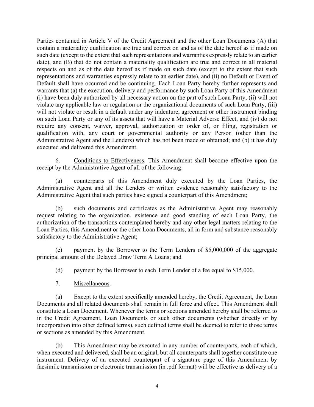 4 Parties contained in Article V of the Credit Agreement and the other Loan Documents (A) that contain a materiality qualification are true and correct on and as of the date hereof as if made on such date (except to the extent that such representations and warranties expressly relate to an earlier date), and (B) that do not contain a materiality qualification are true and correct in all material respects on and as of the date hereof as if made on such date (except to the extent that such representations and warranties expressly relate to an earlier date), and (ii) no Default or Event of Default shall have occurred and be continuing. Each Loan Party hereby further represents and warrants that (a) the execution, delivery and performance by such Loan Party of this Amendment (i) have been duly authorized by all necessary action on the part of such Loan Party, (ii) will not violate any applicable law or regulation or the organizational documents of such Loan Party, (iii) will not violate or result in a default under any indenture, agreement or other instrument binding on such Loan Party or any of its assets that will have a Material Adverse Effect, and (iv) do not require any consent, waiver, approval, authorization or order of, or filing, registration or qualification with, any court or governmental authority or any Person (other than the Administrative Agent and the Lenders) which has not been made or obtained; and (b) it has duly executed and delivered this Amendment. 6. Conditions to Effectiveness. This Amendment shall become effective upon the receipt by the Administrative Agent of all of the following: (a) counterparts of this Amendment duly executed by the Loan Parties, the Administrative Agent and all the Lenders or written evidence reasonably satisfactory to the Administrative Agent that such parties have signed a counterpart of this Amendment; (b) such documents and certificates as the Administrative Agent may reasonably request relating to the organization, existence and good standing of each Loan Party, the authorization of the transactions contemplated hereby and any other legal matters relating to the Loan Parties, this Amendment or the other Loan Documents, all in form and substance reasonably satisfactory to the Administrative Agent; (c) payment by the Borrower to the Term Lenders of $5,000,000 of the aggregate principal amount of the Delayed Draw Term A Loans; and (d) payment by the Borrower to each Term Lender of a fee equal to $15,000. 7. Miscellaneous. (a) Except to the extent specifically amended hereby, the Credit Agreement, the Loan Documents and all related documents shall remain in full force and effect. This Amendment shall constitute a Loan Document. Whenever the terms or sections amended hereby shall be referred to in the Credit Agreement, Loan Documents or such other documents (whether directly or by incorporation into other defined terms), such defined terms shall be deemed to refer to those terms or sections as amended by this Amendment. (b) This Amendment may be executed in any number of counterparts, each of which, when executed and delivered, shall be an original, but all counterparts shall together constitute one instrument. Delivery of an executed counterpart of a signature page of this Amendment by facsimile transmission or electronic transmission (in .pdf format) will be effective as delivery of a