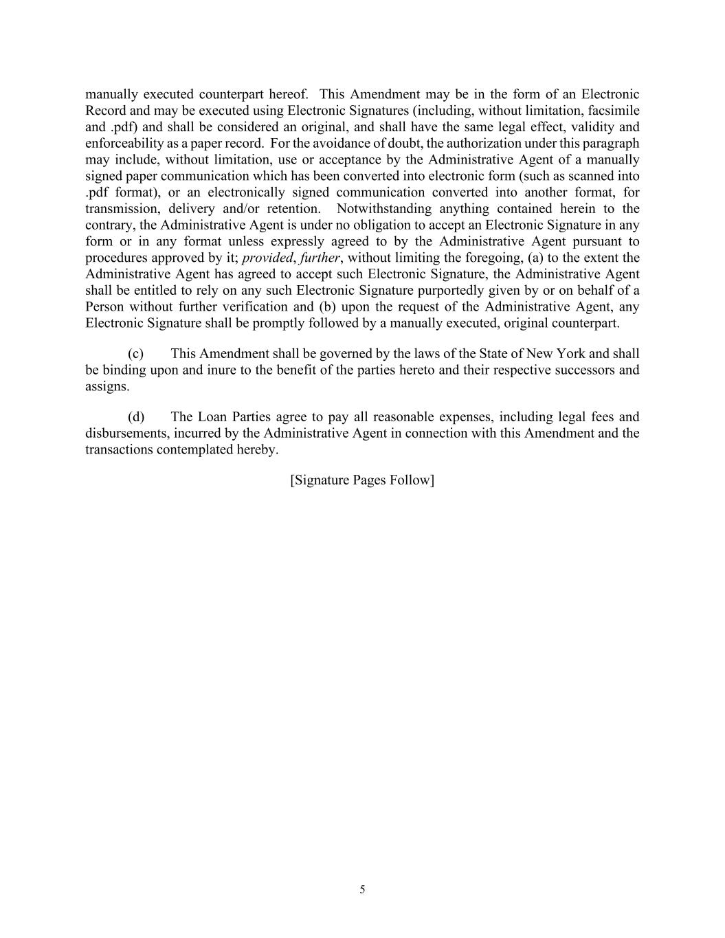 5 manually executed counterpart hereof. This Amendment may be in the form of an Electronic Record and may be executed using Electronic Signatures (including, without limitation, facsimile and .pdf) and shall be considered an original, and shall have the same legal effect, validity and enforceability as a paper record. For the avoidance of doubt, the authorization under this paragraph may include, without limitation, use or acceptance by the Administrative Agent of a manually signed paper communication which has been converted into electronic form (such as scanned into .pdf format), or an electronically signed communication converted into another format, for transmission, delivery and/or retention. Notwithstanding anything contained herein to the contrary, the Administrative Agent is under no obligation to accept an Electronic Signature in any form or in any format unless expressly agreed to by the Administrative Agent pursuant to procedures approved by it; provided, further, without limiting the foregoing, (a) to the extent the Administrative Agent has agreed to accept such Electronic Signature, the Administrative Agent shall be entitled to rely on any such Electronic Signature purportedly given by or on behalf of a Person without further verification and (b) upon the request of the Administrative Agent, any Electronic Signature shall be promptly followed by a manually executed, original counterpart. (c) This Amendment shall be governed by the laws of the State of New York and shall be binding upon and inure to the benefit of the parties hereto and their respective successors and assigns. (d) The Loan Parties agree to pay all reasonable expenses, including legal fees and disbursements, incurred by the Administrative Agent in connection with this Amendment and the transactions contemplated hereby. [Signature Pages Follow]