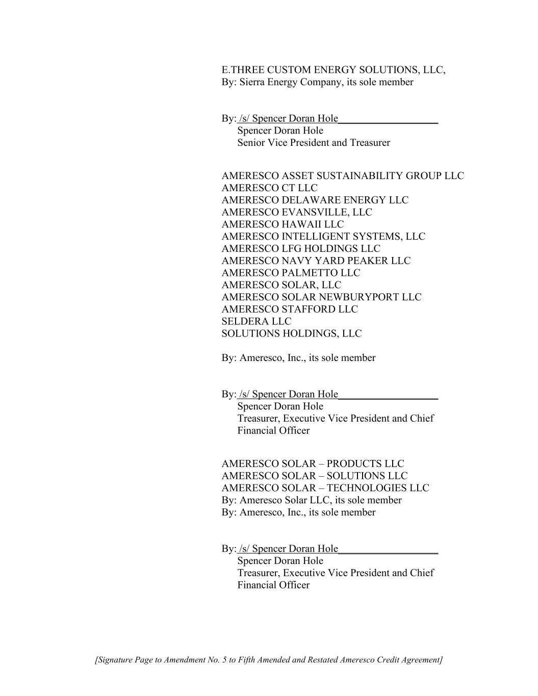 [Signature Page to Amendment No. 5 to Fifth Amended and Restated Ameresco Credit Agreement] E.THREE CUSTOM ENERGY SOLUTIONS, LLC, By: Sierra Energy Company, its sole member By: /s/ Spencer Doran Hole___________________ Spencer Doran Hole Senior Vice President and Treasurer AMERESCO ASSET SUSTAINABILITY GROUP LLC AMERESCO CT LLC AMERESCO DELAWARE ENERGY LLC AMERESCO EVANSVILLE, LLC AMERESCO HAWAII LLC AMERESCO INTELLIGENT SYSTEMS, LLC AMERESCO LFG HOLDINGS LLC AMERESCO NAVY YARD PEAKER LLC AMERESCO PALMETTO LLC AMERESCO SOLAR, LLC AMERESCO SOLAR NEWBURYPORT LLC AMERESCO STAFFORD LLC SELDERA LLC SOLUTIONS HOLDINGS, LLC By: Ameresco, Inc., its sole member By: /s/ Spencer Doran Hole___________________ Spencer Doran Hole Treasurer, Executive Vice President and Chief Financial Officer AMERESCO SOLAR – PRODUCTS LLC AMERESCO SOLAR – SOLUTIONS LLC AMERESCO SOLAR – TECHNOLOGIES LLC By: Ameresco Solar LLC, its sole member By: Ameresco, Inc., its sole member By: /s/ Spencer Doran Hole___________________ Spencer Doran Hole Treasurer, Executive Vice President and Chief Financial Officer