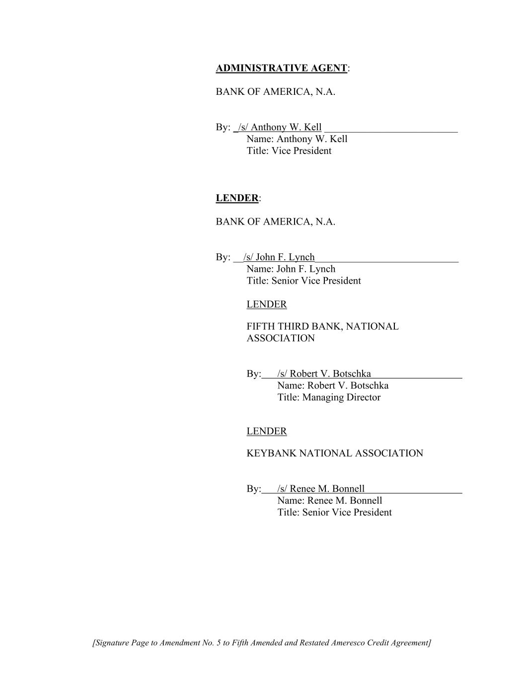 [Signature Page to Amendment No. 5 to Fifth Amended and Restated Ameresco Credit Agreement] ADMINISTRATIVE AGENT: BANK OF AMERICA, N.A. By: _/s/ Anthony W. Kell __________________________ Name: Anthony W. Kell Title: Vice President LENDER: BANK OF AMERICA, N.A. By: __/s/ John F. Lynch____________________________ Name: John F. Lynch Title: Senior Vice President LENDER FIFTH THIRD BANK, NATIONAL ASSOCIATION By: /s/ Robert V. Botschka Name: Robert V. Botschka Title: Managing Director LENDER KEYBANK NATIONAL ASSOCIATION By: /s/ Renee M. Bonnell Name: Renee M. Bonnell Title: Senior Vice President