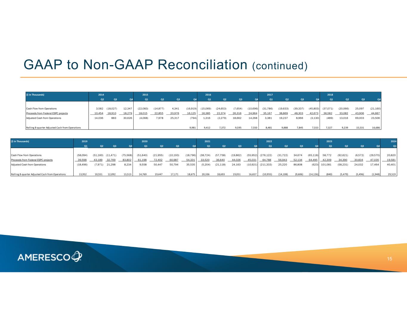 GAAP to Non-GAAP Reconciliation (continued) 15 ($ in Thousands) 2019 2020 2021 2022 2023 2024 Q1 Q2 Q3 Q4 Q1 Q2 Q3 Q4 Q1 Q2 Q3 Q4 Q1 Q2 Q3 Q4 Q1 Q2 Q3 Q4 Q1 Cash Flow from Operations (58,094) (51,160) (11,471) (75,568) (51,640) (21,955) (10,193) (18,796) (38,724) (57,758) (19,862) (55,952) (276,122) (31,722) 34,674 (65,118) 58,772 (92,621) (6,572) (29,570) 20,820 Proceeds from Federal ESPC projects 39,598 43,189 32,769 83,802 61,198 72,402 60,987 54,331 33,520 36,640 44,026 45,031 64,788 56,943 52,134 64,495 42,309 34,390 30,604 47,035 19,581 Adjusted Cash from Operations (18,496) (7,971) 21,298 8,234 9,558 50,447 50,794 35,535 (5,204) (21,118) 24,163 (10,921) (211,333) 25,220 86,808 (623) 101,081 (58,231) 24,032 17,464 40,401 Rolling 8-quarter Adjusted Cash from Operations 13,952 10,551 12,092 13,513 14,769 19,447 17,171 18,675 20,336 18,693 19,051 16,657 (10,955) (14,108) (9,606) (14,126) (840) (5,479) (5,496) (1,948) 29,519 ($ in Thousands) 2014 2015 2016 2017 2018 Q2 Q3 Q4 Q1 Q2 Q3 Q4 Q1 Q2 Q3 Q4 Q1 Q2 Q3 Q4 Q1 Q2 Q3 Q4 Cash Flow from Operations 3,582 (18,027) 12,347 (22,083) (14,877) 4,341 (16,919) (15,069) (24,653) (7,654) (10,696) (31,786) (19,633) (39,337) (45,803) (37,071) (20,066) 25,097 (21,160) Proceeds from Federal ESPC projects 10,454 18,910 18,279 18,015 22,855 20,976 16,125 16,385 22,374 26,316 24,964 35,167 38,869 48,303 42,673 36,582 33,082 43,906 44,667 Adjusted Cash from Operations 14,036 883 30,626 (4,068) 7,978 25,317 (794) 1,316 (2,279) 18,662 14,268 3,381 19,237 8,966 (3,130) (489) 13,016 69,003 23,506 Roll ing 8-quarter Adjusted Cash from Operations 9,981 9,412 7,372 9,595 7,550 8,481 9,888 7,845 7,553 7,327 9,239 15,531 16,686