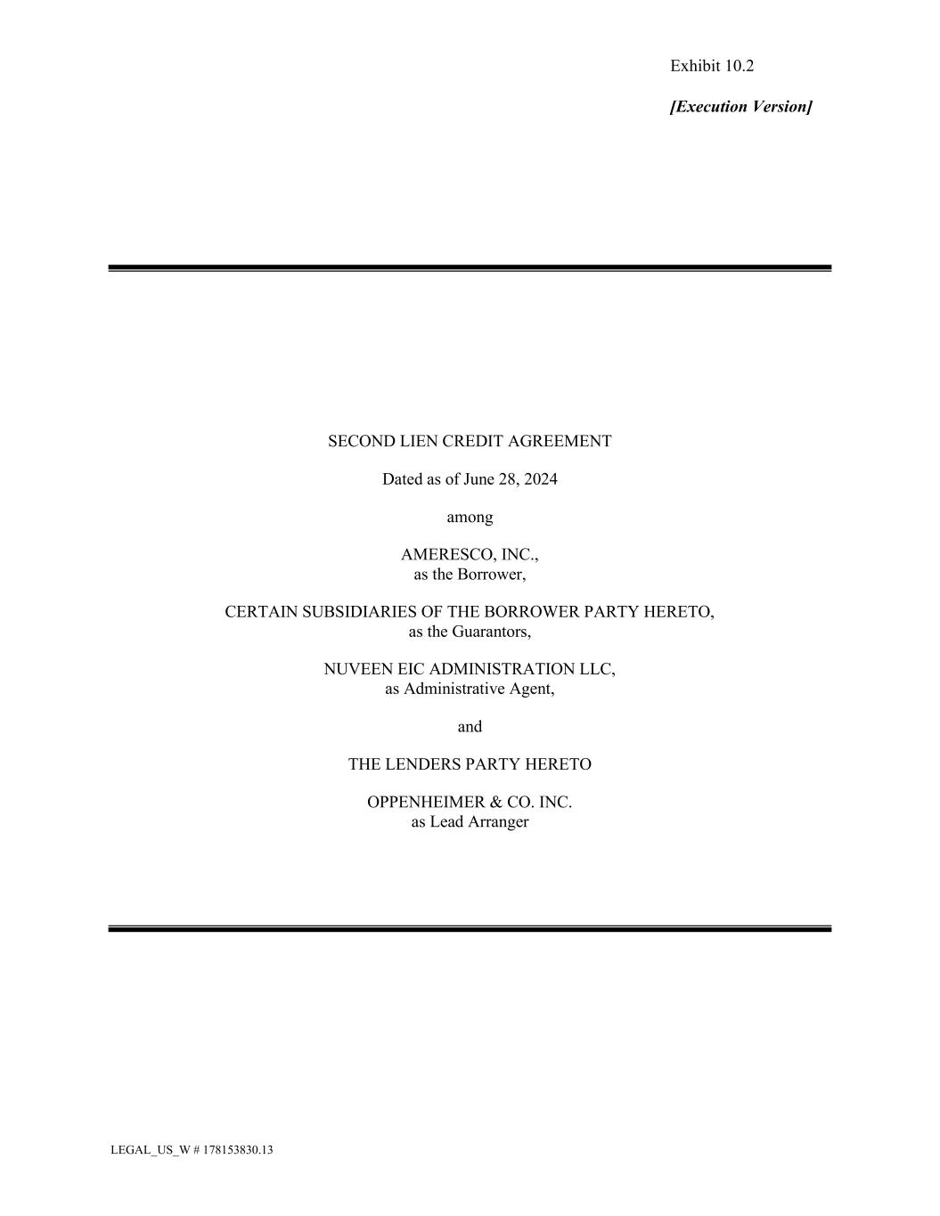 LEGAL_US_W # 178153830.13 Exhibit 10.2 [Execution Version] SECOND LIEN CREDIT AGREEMENT Dated as of June 28, 2024 among AMERESCO, INC., as the Borrower, CERTAIN SUBSIDIARIES OF THE BORROWER PARTY HERETO, as the Guarantors, NUVEEN EIC ADMINISTRATION LLC, as Administrative Agent, and THE LENDERS PARTY HERETO OPPENHEIMER & CO. INC. as Lead Arranger
