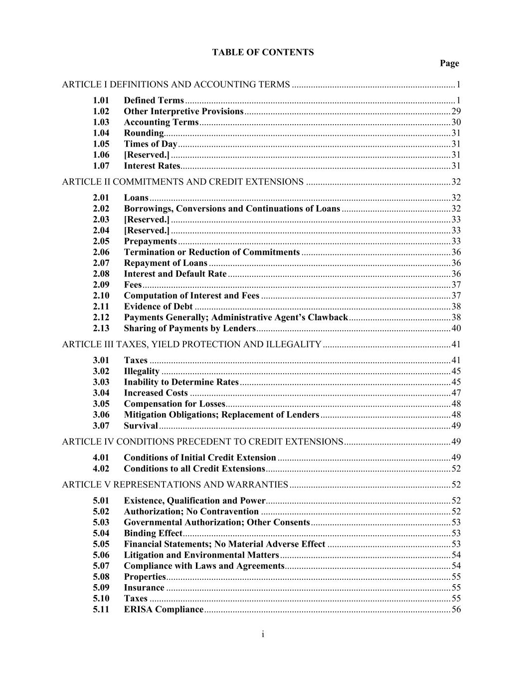 TABLE OF CONTENTS Page i ARTICLE I DEFINITIONS AND ACCOUNTING TERMS ..................................................................... 1 1.01 Defined Terms .................................................................................................................. 1 1.02 Other Interpretive Provisions ....................................................................................... 29 1.03 Accounting Terms .......................................................................................................... 30 1.04 Rounding......................................................................................................................... 31 1.05 Times of Day ................................................................................................................... 31 1.06 [Reserved.] ...................................................................................................................... 31 1.07 Interest Rates .................................................................................................................. 31 ARTICLE II COMMITMENTS AND CREDIT EXTENSIONS ............................................................. 32 2.01 Loans ............................................................................................................................... 32 2.02 Borrowings, Conversions and Continuations of Loans .............................................. 32 2.03 [Reserved.] ...................................................................................................................... 33 2.04 [Reserved.] ...................................................................................................................... 33 2.05 Prepayments ................................................................................................................... 33 2.06 Termination or Reduction of Commitments ............................................................... 36 2.07 Repayment of Loans ...................................................................................................... 36 2.08 Interest and Default Rate .............................................................................................. 36 2.09 Fees .................................................................................................................................. 37 2.10 Computation of Interest and Fees ................................................................................ 37 2.11 Evidence of Debt ............................................................................................................ 38 2.12 Payments Generally; Administrative Agent’s Clawback ........................................... 38 2.13 Sharing of Payments by Lenders .................................................................................. 40 ARTICLE III TAXES, YIELD PROTECTION AND ILLEGALITY ...................................................... 41 3.01 Taxes ............................................................................................................................... 41 3.02 Illegality .......................................................................................................................... 45 3.03 Inability to Determine Rates ......................................................................................... 45 3.04 Increased Costs .............................................................................................................. 47 3.05 Compensation for Losses ............................................................................................... 48 3.06 Mitigation Obligations; Replacement of Lenders ....................................................... 48 3.07 Survival ........................................................................................................................... 49 ARTICLE IV CONDITIONS PRECEDENT TO CREDIT EXTENSIONS ............................................. 49 4.01 Conditions of Initial Credit Extension ......................................................................... 49 4.02 Conditions to all Credit Extensions .............................................................................. 52 ARTICLE V REPRESENTATIONS AND WARRANTIES .................................................................... 52 5.01 Existence, Qualification and Power .............................................................................. 52 5.02 Authorization; No Contravention ................................................................................ 52 5.03 Governmental Authorization; Other Consents ........................................................... 53 5.04 Binding Effect ................................................................................................................. 53 5.05 Financial Statements; No Material Adverse Effect .................................................... 53 5.06 Litigation and Environmental Matters ........................................................................ 54 5.07 Compliance with Laws and Agreements ...................................................................... 54 5.08 Properties ........................................................................................................................ 55 5.09 Insurance ........................................................................................................................ 55 5.10 Taxes ............................................................................................................................... 55 5.11 ERISA Compliance ........................................................................................................ 56