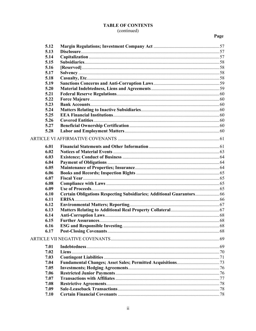 TABLE OF CONTENTS (continued) Page ii 5.12 Margin Regulations; Investment Company Act ......................................................... 57 5.13 Disclosure ........................................................................................................................ 57 5.14 Capitalization ................................................................................................................. 57 5.15 Subsidiaries..................................................................................................................... 58 5.16 [Reserved] ....................................................................................................................... 58 5.17 Solvency .......................................................................................................................... 58 5.18 Casualty, Etc................................................................................................................... 58 5.19 Sanctions Concerns and Anti-Corruption Laws ......................................................... 59 5.20 Material Indebtedness, Liens and Agreements ........................................................... 59 5.21 Federal Reserve Regulations ......................................................................................... 60 5.22 Force Majeure ................................................................................................................ 60 5.23 Bank Accounts ................................................................................................................ 60 5.24 Matters Relating to Inactive Subsidiaries .................................................................... 60 5.25 EEA Financial Institutions ............................................................................................ 60 5.26 Covered Entities ............................................................................................................. 60 5.27 Beneficial Ownership Certification .............................................................................. 60 5.28 Labor and Employment Matters .................................................................................. 60 ARTICLE VI AFFIRMATIVE COVENANTS ........................................................................................ 61 6.01 Financial Statements and Other Information ............................................................. 61 6.02 Notices of Material Events ............................................................................................ 63 6.03 Existence; Conduct of Business .................................................................................... 64 6.04 Payment of Obligations ................................................................................................. 64 6.05 Maintenance of Properties; Insurance ......................................................................... 64 6.06 Books and Records; Inspection Rights ........................................................................ 65 6.07 Fiscal Year ...................................................................................................................... 65 6.08 Compliance with Laws .................................................................................................. 65 6.09 Use of Proceeds ............................................................................................................... 65 6.10 Certain Obligations Respecting Subsidiaries; Additional Guarantors ..................... 66 6.11 ERISA ............................................................................................................................. 66 6.12 Environmental Matters; Reporting .............................................................................. 67 6.13 Matters Relating to Additional Real Property Collateral .......................................... 67 6.14 Anti-Corruption Laws ................................................................................................... 68 6.15 Further Assurances ........................................................................................................ 68 6.16 ESG and Responsible Investing. ................................................................................... 68 6.17 Post-Closing Covenants ................................................................................................. 68 ARTICLE VII NEGATIVE COVENANTS .............................................................................................. 69 7.01 Indebtedness ................................................................................................................... 69 7.02 Liens ................................................................................................................................ 70 7.03 Contingent Liabilities .................................................................................................... 71 7.04 Fundamental Changes; Asset Sales; Permitted Acquisitions..................................... 73 7.05 Investments; Hedging Agreements ............................................................................... 76 7.06 Restricted Junior Payments .......................................................................................... 76 7.07 Transactions with Affiliates .......................................................................................... 77 7.08 Restrictive Agreements .................................................................................................. 78 7.09 Sale-Leaseback Transactions ........................................................................................ 78 7.10 Certain Financial Covenants ........................................................................................ 78