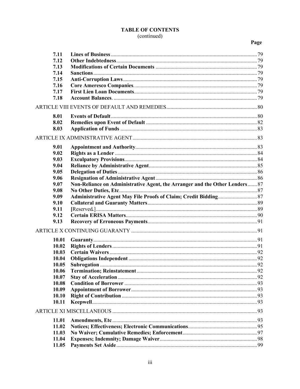 TABLE OF CONTENTS (continued) Page iii 7.11 Lines of Business ............................................................................................................ 79 7.12 Other Indebtedness ........................................................................................................ 79 7.13 Modifications of Certain Documents ........................................................................... 79 7.14 Sanctions ......................................................................................................................... 79 7.15 Anti-Corruption Laws ................................................................................................... 79 7.16 Core Ameresco Companies. .......................................................................................... 79 7.17 First Lien Loan Documents........................................................................................... 79 7.18 Account Balances. .......................................................................................................... 79 ARTICLE VIII EVENTS OF DEFAULT AND REMEDIES ................................................................... 80 8.01 Events of Default ............................................................................................................ 80 8.02 Remedies upon Event of Default .................................................................................. 82 8.03 Application of Funds ..................................................................................................... 83 ARTICLE IX ADMINISTRATIVE AGENT ............................................................................................ 83 9.01 Appointment and Authority.......................................................................................... 83 9.02 Rights as a Lender ......................................................................................................... 84 9.03 Exculpatory Provisions .................................................................................................. 84 9.04 Reliance by Administrative Agent ................................................................................ 85 9.05 Delegation of Duties ....................................................................................................... 86 9.06 Resignation of Administrative Agent ........................................................................... 86 9.07 Non-Reliance on Administrative Agent, the Arranger and the Other Lenders ....... 87 9.08 No Other Duties, Etc ...................................................................................................... 87 9.09 Administrative Agent May File Proofs of Claim; Credit Bidding ............................. 87 9.10 Collateral and Guaranty Matters ................................................................................. 89 9.11 [Reserved.] ....................................................................................................................... 89 9.12 Certain ERISA Matters ................................................................................................. 90 9.13 Recovery of Erroneous Payments ................................................................................. 91 ARTICLE X CONTINUING GUARANTY ............................................................................................. 91 10.01 Guaranty ......................................................................................................................... 91 10.02 Rights of Lenders ........................................................................................................... 91 10.03 Certain Waivers ............................................................................................................. 92 10.04 Obligations Independent ............................................................................................... 92 10.05 Subrogation .................................................................................................................... 92 10.06 Termination; Reinstatement ......................................................................................... 92 10.07 Stay of Acceleration ....................................................................................................... 92 10.08 Condition of Borrower .................................................................................................. 93 10.09 Appointment of Borrower ............................................................................................. 93 10.10 Right of Contribution .................................................................................................... 93 10.11 Keepwell .......................................................................................................................... 93 ARTICLE XI MISCELLANEOUS ........................................................................................................... 93 11.01 Amendments, Etc ........................................................................................................... 93 11.02 Notices; Effectiveness; Electronic Communications ................................................... 95 11.03 No Waiver; Cumulative Remedies; Enforcement ....................................................... 97 11.04 Expenses; Indemnity; Damage Waiver ........................................................................ 98 11.05 Payments Set Aside ........................................................................................................ 99