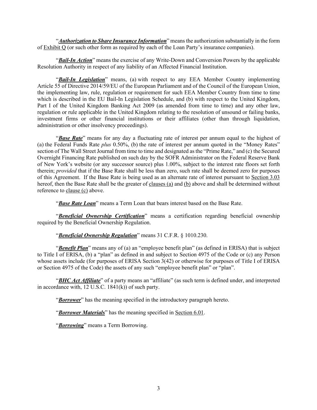 3 “Authorization to Share Insurance Information” means the authorization substantially in the form of Exhibit Q (or such other form as required by each of the Loan Party’s insurance companies). “Bail-In Action” means the exercise of any Write-Down and Conversion Powers by the applicable Resolution Authority in respect of any liability of an Affected Financial Institution. “Bail-In Legislation” means, (a) with respect to any EEA Member Country implementing Article 55 of Directive 2014/59/EU of the European Parliament and of the Council of the European Union, the implementing law, rule, regulation or requirement for such EEA Member Country from time to time which is described in the EU Bail-In Legislation Schedule, and (b) with respect to the United Kingdom, Part I of the United Kingdom Banking Act 2009 (as amended from time to time) and any other law, regulation or rule applicable in the United Kingdom relating to the resolution of unsound or failing banks, investment firms or other financial institutions or their affiliates (other than through liquidation, administration or other insolvency proceedings). “Base Rate” means for any day a fluctuating rate of interest per annum equal to the highest of (a) the Federal Funds Rate plus 0.50%, (b) the rate of interest per annum quoted in the “Money Rates” section of The Wall Street Journal from time to time and designated as the “Prime Rate,” and (c) the Secured Overnight Financing Rate published on such day by the SOFR Administrator on the Federal Reserve Bank of New York’s website (or any successor source) plus 1.00%, subject to the interest rate floors set forth therein; provided that if the Base Rate shall be less than zero, such rate shall be deemed zero for purposes of this Agreement. If the Base Rate is being used as an alternate rate of interest pursuant to Section 3.03 hereof, then the Base Rate shall be the greater of clauses (a) and (b) above and shall be determined without reference to clause (c) above. “Base Rate Loan” means a Term Loan that bears interest based on the Base Rate. “Beneficial Ownership Certification” means a certification regarding beneficial ownership required by the Beneficial Ownership Regulation. “Beneficial Ownership Regulation” means 31 C.F.R. § 1010.230. “Benefit Plan” means any of (a) an “employee benefit plan” (as defined in ERISA) that is subject to Title I of ERISA, (b) a “plan” as defined in and subject to Section 4975 of the Code or (c) any Person whose assets include (for purposes of ERISA Section 3(42) or otherwise for purposes of Title I of ERISA or Section 4975 of the Code) the assets of any such “employee benefit plan” or “plan”. “BHC Act Affiliate” of a party means an “affiliate” (as such term is defined under, and interpreted in accordance with, 12 U.S.C. 1841(k)) of such party. “Borrower” has the meaning specified in the introductory paragraph hereto. “Borrower Materials” has the meaning specified in Section 6.01. “Borrowing” means a Term Borrowing.