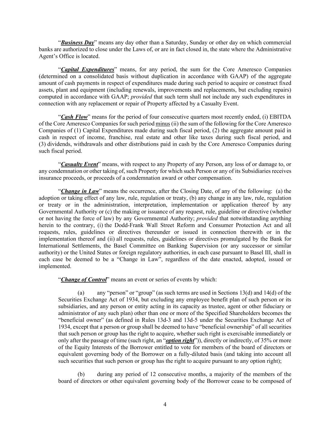 4 “Business Day” means any day other than a Saturday, Sunday or other day on which commercial banks are authorized to close under the Laws of, or are in fact closed in, the state where the Administrative Agent’s Office is located. “Capital Expenditures” means, for any period, the sum for the Core Ameresco Companies (determined on a consolidated basis without duplication in accordance with GAAP) of the aggregate amount of cash payments in respect of expenditures made during such period to acquire or construct fixed assets, plant and equipment (including renewals, improvements and replacements, but excluding repairs) computed in accordance with GAAP; provided that such term shall not include any such expenditures in connection with any replacement or repair of Property affected by a Casualty Event. “Cash Flow” means for the period of four consecutive quarters most recently ended, (i) EBITDA of the Core Ameresco Companies for such period minus (ii) the sum of the following for the Core Ameresco Companies of (1) Capital Expenditures made during such fiscal period, (2) the aggregate amount paid in cash in respect of income, franchise, real estate and other like taxes during such fiscal period, and (3) dividends, withdrawals and other distributions paid in cash by the Core Ameresco Companies during such fiscal period. “Casualty Event” means, with respect to any Property of any Person, any loss of or damage to, or any condemnation or other taking of, such Property for which such Person or any of its Subsidiaries receives insurance proceeds, or proceeds of a condemnation award or other compensation. “Change in Law” means the occurrence, after the Closing Date, of any of the following: (a) the adoption or taking effect of any law, rule, regulation or treaty, (b) any change in any law, rule, regulation or treaty or in the administration, interpretation, implementation or application thereof by any Governmental Authority or (c) the making or issuance of any request, rule, guideline or directive (whether or not having the force of law) by any Governmental Authority; provided that notwithstanding anything herein to the contrary, (i) the Dodd-Frank Wall Street Reform and Consumer Protection Act and all requests, rules, guidelines or directives thereunder or issued in connection therewith or in the implementation thereof and (ii) all requests, rules, guidelines or directives promulgated by the Bank for International Settlements, the Basel Committee on Banking Supervision (or any successor or similar authority) or the United States or foreign regulatory authorities, in each case pursuant to Basel III, shall in each case be deemed to be a “Change in Law”, regardless of the date enacted, adopted, issued or implemented. “Change of Control” means an event or series of events by which: (a) any “person” or “group” (as such terms are used in Sections 13(d) and 14(d) of the Securities Exchange Act of 1934, but excluding any employee benefit plan of such person or its subsidiaries, and any person or entity acting in its capacity as trustee, agent or other fiduciary or administrator of any such plan) other than one or more of the Specified Shareholders becomes the “beneficial owner” (as defined in Rules 13d-3 and 13d-5 under the Securities Exchange Act of 1934, except that a person or group shall be deemed to have “beneficial ownership” of all securities that such person or group has the right to acquire, whether such right is exercisable immediately or only after the passage of time (such right, an “option right”)), directly or indirectly, of 35% or more of the Equity Interests of the Borrower entitled to vote for members of the board of directors or equivalent governing body of the Borrower on a fully-diluted basis (and taking into account all such securities that such person or group has the right to acquire pursuant to any option right); (b) during any period of 12 consecutive months, a majority of the members of the board of directors or other equivalent governing body of the Borrower cease to be composed of