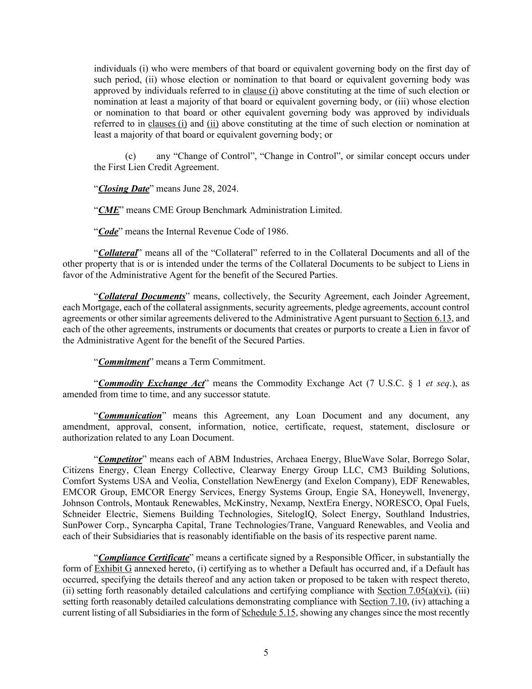 5 individuals (i) who were members of that board or equivalent governing body on the first day of such period, (ii) whose election or nomination to that board or equivalent governing body was approved by individuals referred to in clause (i) above constituting at the time of such election or nomination at least a majority of that board or equivalent governing body, or (iii) whose election or nomination to that board or other equivalent governing body was approved by individuals referred to in clauses (i) and (ii) above constituting at the time of such election or nomination at least a majority of that board or equivalent governing body; or (c) any “Change of Control”, “Change in Control”, or similar concept occurs under the First Lien Credit Agreement. “Closing Date” means June 28, 2024. “CME” means CME Group Benchmark Administration Limited. “Code” means the Internal Revenue Code of 1986. “Collateral” means all of the “Collateral” referred to in the Collateral Documents and all of the other property that is or is intended under the terms of the Collateral Documents to be subject to Liens in favor of the Administrative Agent for the benefit of the Secured Parties. “Collateral Documents” means, collectively, the Security Agreement, each Joinder Agreement, each Mortgage, each of the collateral assignments, security agreements, pledge agreements, account control agreements or other similar agreements delivered to the Administrative Agent pursuant to Section 6.13, and each of the other agreements, instruments or documents that creates or purports to create a Lien in favor of the Administrative Agent for the benefit of the Secured Parties. “Commitment” means a Term Commitment. “Commodity Exchange Act” means the Commodity Exchange Act (7 U.S.C. § 1 et seq.), as amended from time to time, and any successor statute. “Communication” means this Agreement, any Loan Document and any document, any amendment, approval, consent, information, notice, certificate, request, statement, disclosure or authorization related to any Loan Document. “Competitor” means each of ABM Industries, Archaea Energy, BlueWave Solar, Borrego Solar, Citizens Energy, Clean Energy Collective, Clearway Energy Group LLC, CM3 Building Solutions, Comfort Systems USA and Veolia, Constellation NewEnergy (and Exelon Company), EDF Renewables, EMCOR Group, EMCOR Energy Services, Energy Systems Group, Engie SA, Honeywell, Invenergy, Johnson Controls, Montauk Renewables, McKinstry, Nexamp, NextEra Energy, NORESCO, Opal Fuels, Schneider Electric, Siemens Building Technologies, SitelogIQ, Solect Energy, Southland Industries, SunPower Corp., Syncarpha Capital, Trane Technologies/Trane, Vanguard Renewables, and Veolia and each of their Subsidiaries that is reasonably identifiable on the basis of its respective parent name. “Compliance Certificate” means a certificate signed by a Responsible Officer, in substantially the form of Exhibit G annexed hereto, (i) certifying as to whether a Default has occurred and, if a Default has occurred, specifying the details thereof and any action taken or proposed to be taken with respect thereto, (ii) setting forth reasonably detailed calculations and certifying compliance with Section 7.05(a)(vi), (iii) setting forth reasonably detailed calculations demonstrating compliance with Section 7.10, (iv) attaching a current listing of all Subsidiaries in the form of Schedule 5.15, showing any changes since the most recently