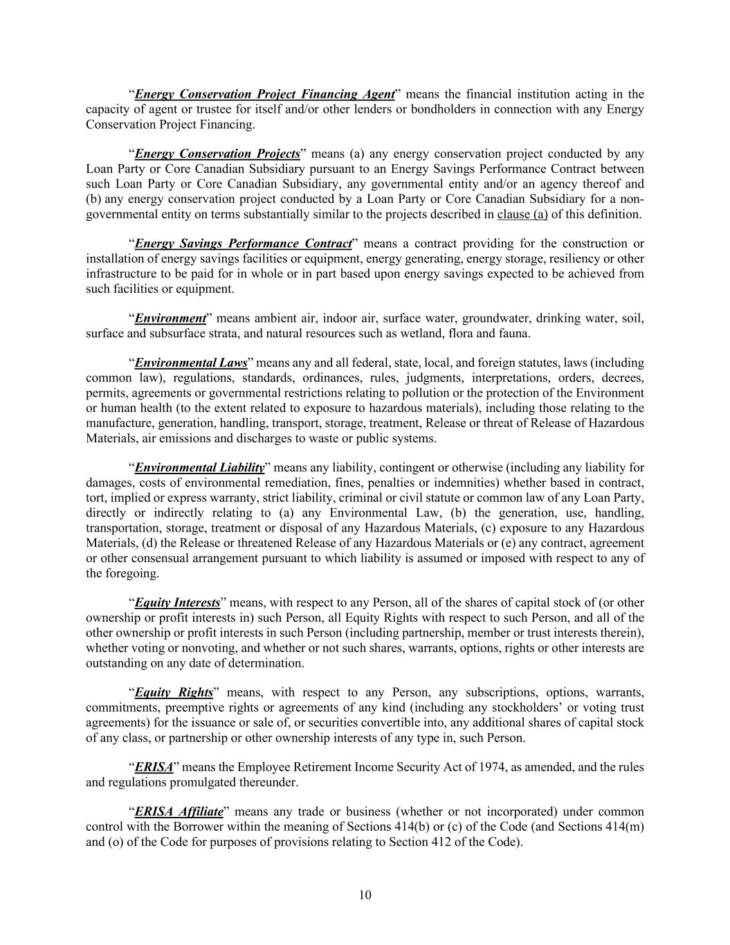 10 “Energy Conservation Project Financing Agent” means the financial institution acting in the capacity of agent or trustee for itself and/or other lenders or bondholders in connection with any Energy Conservation Project Financing. “Energy Conservation Projects” means (a) any energy conservation project conducted by any Loan Party or Core Canadian Subsidiary pursuant to an Energy Savings Performance Contract between such Loan Party or Core Canadian Subsidiary, any governmental entity and/or an agency thereof and (b) any energy conservation project conducted by a Loan Party or Core Canadian Subsidiary for a non- governmental entity on terms substantially similar to the projects described in clause (a) of this definition. “Energy Savings Performance Contract” means a contract providing for the construction or installation of energy savings facilities or equipment, energy generating, energy storage, resiliency or other infrastructure to be paid for in whole or in part based upon energy savings expected to be achieved from such facilities or equipment. “Environment” means ambient air, indoor air, surface water, groundwater, drinking water, soil, surface and subsurface strata, and natural resources such as wetland, flora and fauna. “Environmental Laws” means any and all federal, state, local, and foreign statutes, laws (including common law), regulations, standards, ordinances, rules, judgments, interpretations, orders, decrees, permits, agreements or governmental restrictions relating to pollution or the protection of the Environment or human health (to the extent related to exposure to hazardous materials), including those relating to the manufacture, generation, handling, transport, storage, treatment, Release or threat of Release of Hazardous Materials, air emissions and discharges to waste or public systems. “Environmental Liability” means any liability, contingent or otherwise (including any liability for damages, costs of environmental remediation, fines, penalties or indemnities) whether based in contract, tort, implied or express warranty, strict liability, criminal or civil statute or common law of any Loan Party, directly or indirectly relating to (a) any Environmental Law, (b) the generation, use, handling, transportation, storage, treatment or disposal of any Hazardous Materials, (c) exposure to any Hazardous Materials, (d) the Release or threatened Release of any Hazardous Materials or (e) any contract, agreement or other consensual arrangement pursuant to which liability is assumed or imposed with respect to any of the foregoing. “Equity Interests” means, with respect to any Person, all of the shares of capital stock of (or other ownership or profit interests in) such Person, all Equity Rights with respect to such Person, and all of the other ownership or profit interests in such Person (including partnership, member or trust interests therein), whether voting or nonvoting, and whether or not such shares, warrants, options, rights or other interests are outstanding on any date of determination. “Equity Rights” means, with respect to any Person, any subscriptions, options, warrants, commitments, preemptive rights or agreements of any kind (including any stockholders’ or voting trust agreements) for the issuance or sale of, or securities convertible into, any additional shares of capital stock of any class, or partnership or other ownership interests of any type in, such Person. “ERISA” means the Employee Retirement Income Security Act of 1974, as amended, and the rules and regulations promulgated thereunder. “ERISA Affiliate” means any trade or business (whether or not incorporated) under common control with the Borrower within the meaning of Sections 414(b) or (c) of the Code (and Sections 414(m) and (o) of the Code for purposes of provisions relating to Section 412 of the Code).