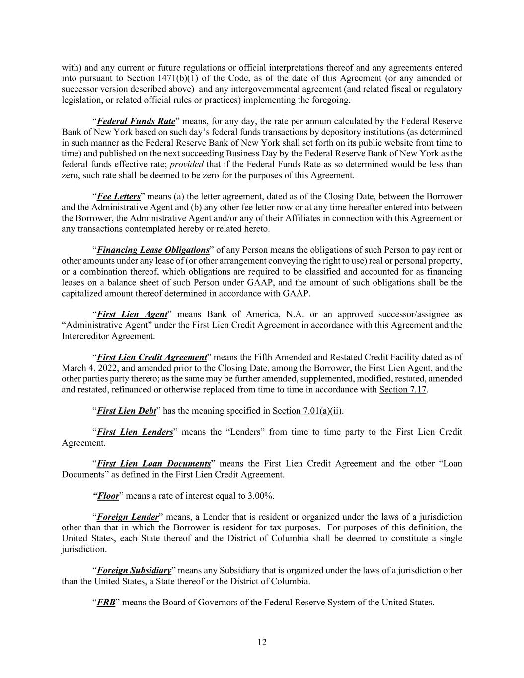 12 with) and any current or future regulations or official interpretations thereof and any agreements entered into pursuant to Section 1471(b)(1) of the Code, as of the date of this Agreement (or any amended or successor version described above) and any intergovernmental agreement (and related fiscal or regulatory legislation, or related official rules or practices) implementing the foregoing. “Federal Funds Rate” means, for any day, the rate per annum calculated by the Federal Reserve Bank of New York based on such day’s federal funds transactions by depository institutions (as determined in such manner as the Federal Reserve Bank of New York shall set forth on its public website from time to time) and published on the next succeeding Business Day by the Federal Reserve Bank of New York as the federal funds effective rate; provided that if the Federal Funds Rate as so determined would be less than zero, such rate shall be deemed to be zero for the purposes of this Agreement. “Fee Letters” means (a) the letter agreement, dated as of the Closing Date, between the Borrower and the Administrative Agent and (b) any other fee letter now or at any time hereafter entered into between the Borrower, the Administrative Agent and/or any of their Affiliates in connection with this Agreement or any transactions contemplated hereby or related hereto. “Financing Lease Obligations” of any Person means the obligations of such Person to pay rent or other amounts under any lease of (or other arrangement conveying the right to use) real or personal property, or a combination thereof, which obligations are required to be classified and accounted for as financing leases on a balance sheet of such Person under GAAP, and the amount of such obligations shall be the capitalized amount thereof determined in accordance with GAAP. “First Lien Agent” means Bank of America, N.A. or an approved successor/assignee as “Administrative Agent” under the First Lien Credit Agreement in accordance with this Agreement and the Intercreditor Agreement. “First Lien Credit Agreement” means the Fifth Amended and Restated Credit Facility dated as of March 4, 2022, and amended prior to the Closing Date, among the Borrower, the First Lien Agent, and the other parties party thereto; as the same may be further amended, supplemented, modified, restated, amended and restated, refinanced or otherwise replaced from time to time in accordance with Section 7.17. “First Lien Debt” has the meaning specified in Section 7.01(a)(ii). “First Lien Lenders” means the “Lenders” from time to time party to the First Lien Credit Agreement. “First Lien Loan Documents” means the First Lien Credit Agreement and the other “Loan Documents” as defined in the First Lien Credit Agreement. “Floor” means a rate of interest equal to 3.00%. “Foreign Lender” means, a Lender that is resident or organized under the laws of a jurisdiction other than that in which the Borrower is resident for tax purposes. For purposes of this definition, the United States, each State thereof and the District of Columbia shall be deemed to constitute a single jurisdiction. “Foreign Subsidiary” means any Subsidiary that is organized under the laws of a jurisdiction other than the United States, a State thereof or the District of Columbia. “FRB” means the Board of Governors of the Federal Reserve System of the United States.