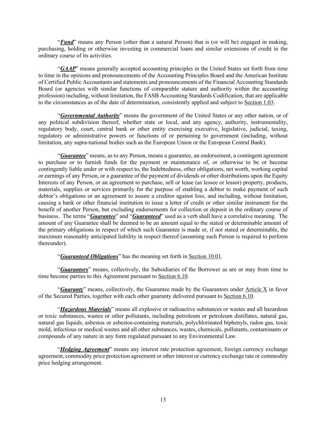 13 “Fund” means any Person (other than a natural Person) that is (or will be) engaged in making, purchasing, holding or otherwise investing in commercial loans and similar extensions of credit in the ordinary course of its activities. “GAAP” means generally accepted accounting principles in the United States set forth from time to time in the opinions and pronouncements of the Accounting Principles Board and the American Institute of Certified Public Accountants and statements and pronouncements of the Financial Accounting Standards Board (or agencies with similar functions of comparable stature and authority within the accounting profession) including, without limitation, the FASB Accounting Standards Codification, that are applicable to the circumstances as of the date of determination, consistently applied and subject to Section 1.03. “Governmental Authority” means the government of the United States or any other nation, or of any political subdivision thereof, whether state or local, and any agency, authority, instrumentality, regulatory body, court, central bank or other entity exercising executive, legislative, judicial, taxing, regulatory or administrative powers or functions of or pertaining to government (including, without limitation, any supra-national bodies such as the European Union or the European Central Bank). “Guarantee” means, as to any Person, means a guarantee, an endorsement, a contingent agreement to purchase or to furnish funds for the payment or maintenance of, or otherwise to be or become contingently liable under or with respect to, the Indebtedness, other obligations, net worth, working capital or earnings of any Person, or a guarantee of the payment of dividends or other distributions upon the Equity Interests of any Person, or an agreement to purchase, sell or lease (as lessee or lessor) property, products, materials, supplies or services primarily for the purpose of enabling a debtor to make payment of such debtor’s obligations or an agreement to assure a creditor against loss, and including, without limitation, causing a bank or other financial institution to issue a letter of credit or other similar instrument for the benefit of another Person, but excluding endorsements for collection or deposit in the ordinary course of business. The terms “Guarantee” and “Guaranteed” used as a verb shall have a correlative meaning. The amount of any Guarantee shall be deemed to be an amount equal to the stated or determinable amount of the primary obligations in respect of which such Guarantee is made or, if not stated or determinable, the maximum reasonably anticipated liability in respect thereof (assuming such Person is required to perform thereunder). “Guaranteed Obligations” has the meaning set forth in Section 10.01. “Guarantors” means, collectively, the Subsidiaries of the Borrower as are or may from time to time become parties to this Agreement pursuant to Section 6.10. “Guaranty” means, collectively, the Guarantee made by the Guarantors under Article X in favor of the Secured Parties, together with each other guaranty delivered pursuant to Section 6.10. “Hazardous Materials” means all explosive or radioactive substances or wastes and all hazardous or toxic substances, wastes or other pollutants, including petroleum or petroleum distillates, natural gas, natural gas liquids, asbestos or asbestos-containing materials, polychlorinated biphenyls, radon gas, toxic mold, infectious or medical wastes and all other substances, wastes, chemicals, pollutants, contaminants or compounds of any nature in any form regulated pursuant to any Environmental Law. “Hedging Agreement” means any interest rate protection agreement, foreign currency exchange agreement, commodity price protection agreement or other interest or currency exchange rate or commodity price hedging arrangement.