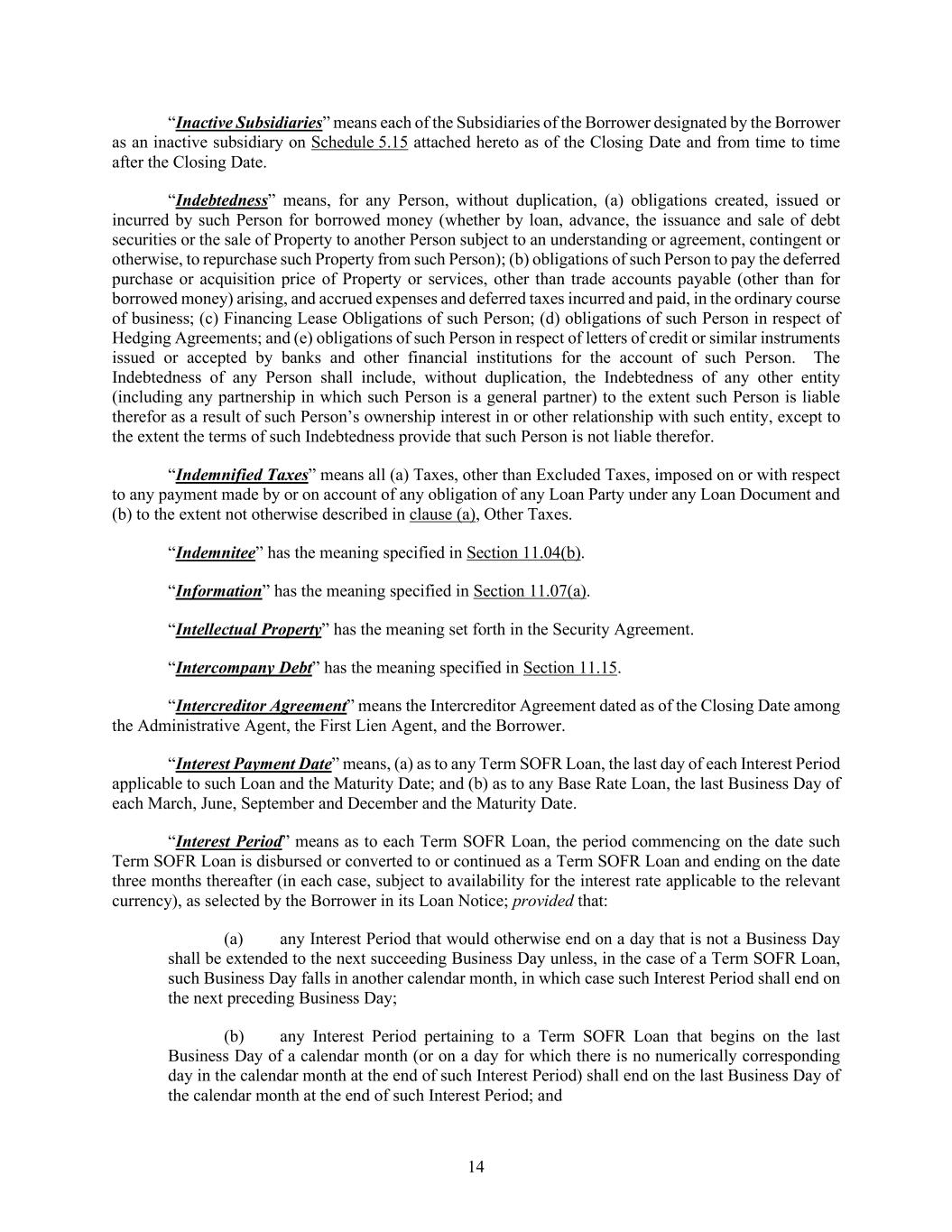 14 “Inactive Subsidiaries” means each of the Subsidiaries of the Borrower designated by the Borrower as an inactive subsidiary on Schedule 5.15 attached hereto as of the Closing Date and from time to time after the Closing Date. “Indebtedness” means, for any Person, without duplication, (a) obligations created, issued or incurred by such Person for borrowed money (whether by loan, advance, the issuance and sale of debt securities or the sale of Property to another Person subject to an understanding or agreement, contingent or otherwise, to repurchase such Property from such Person); (b) obligations of such Person to pay the deferred purchase or acquisition price of Property or services, other than trade accounts payable (other than for borrowed money) arising, and accrued expenses and deferred taxes incurred and paid, in the ordinary course of business; (c) Financing Lease Obligations of such Person; (d) obligations of such Person in respect of Hedging Agreements; and (e) obligations of such Person in respect of letters of credit or similar instruments issued or accepted by banks and other financial institutions for the account of such Person. The Indebtedness of any Person shall include, without duplication, the Indebtedness of any other entity (including any partnership in which such Person is a general partner) to the extent such Person is liable therefor as a result of such Person’s ownership interest in or other relationship with such entity, except to the extent the terms of such Indebtedness provide that such Person is not liable therefor. “Indemnified Taxes” means all (a) Taxes, other than Excluded Taxes, imposed on or with respect to any payment made by or on account of any obligation of any Loan Party under any Loan Document and (b) to the extent not otherwise described in clause (a), Other Taxes. “Indemnitee” has the meaning specified in Section 11.04(b). “Information” has the meaning specified in Section 11.07(a). “Intellectual Property” has the meaning set forth in the Security Agreement. “Intercompany Debt” has the meaning specified in Section 11.15. “Intercreditor Agreement” means the Intercreditor Agreement dated as of the Closing Date among the Administrative Agent, the First Lien Agent, and the Borrower. “Interest Payment Date” means, (a) as to any Term SOFR Loan, the last day of each Interest Period applicable to such Loan and the Maturity Date; and (b) as to any Base Rate Loan, the last Business Day of each March, June, September and December and the Maturity Date. “Interest Period” means as to each Term SOFR Loan, the period commencing on the date such Term SOFR Loan is disbursed or converted to or continued as a Term SOFR Loan and ending on the date three months thereafter (in each case, subject to availability for the interest rate applicable to the relevant currency), as selected by the Borrower in its Loan Notice; provided that: (a) any Interest Period that would otherwise end on a day that is not a Business Day shall be extended to the next succeeding Business Day unless, in the case of a Term SOFR Loan, such Business Day falls in another calendar month, in which case such Interest Period shall end on the next preceding Business Day; (b) any Interest Period pertaining to a Term SOFR Loan that begins on the last Business Day of a calendar month (or on a day for which there is no numerically corresponding day in the calendar month at the end of such Interest Period) shall end on the last Business Day of the calendar month at the end of such Interest Period; and