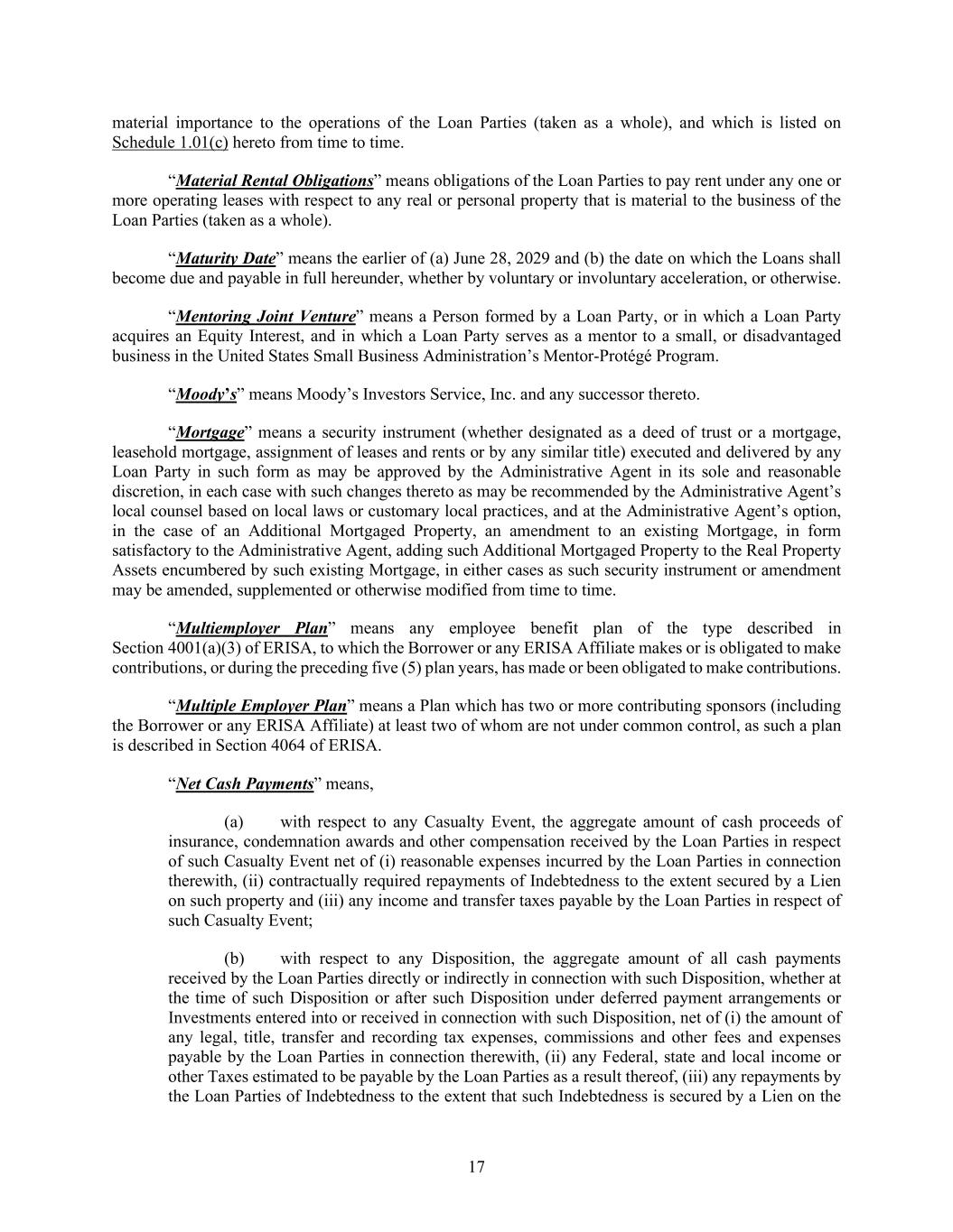 17 material importance to the operations of the Loan Parties (taken as a whole), and which is listed on Schedule 1.01(c) hereto from time to time. “Material Rental Obligations” means obligations of the Loan Parties to pay rent under any one or more operating leases with respect to any real or personal property that is material to the business of the Loan Parties (taken as a whole). “Maturity Date” means the earlier of (a) June 28, 2029 and (b) the date on which the Loans shall become due and payable in full hereunder, whether by voluntary or involuntary acceleration, or otherwise. “Mentoring Joint Venture” means a Person formed by a Loan Party, or in which a Loan Party acquires an Equity Interest, and in which a Loan Party serves as a mentor to a small, or disadvantaged business in the United States Small Business Administration’s Mentor-Protégé Program. “Moody’s” means Moody’s Investors Service, Inc. and any successor thereto. “Mortgage” means a security instrument (whether designated as a deed of trust or a mortgage, leasehold mortgage, assignment of leases and rents or by any similar title) executed and delivered by any Loan Party in such form as may be approved by the Administrative Agent in its sole and reasonable discretion, in each case with such changes thereto as may be recommended by the Administrative Agent’s local counsel based on local laws or customary local practices, and at the Administrative Agent’s option, in the case of an Additional Mortgaged Property, an amendment to an existing Mortgage, in form satisfactory to the Administrative Agent, adding such Additional Mortgaged Property to the Real Property Assets encumbered by such existing Mortgage, in either cases as such security instrument or amendment may be amended, supplemented or otherwise modified from time to time. “Multiemployer Plan” means any employee benefit plan of the type described in Section 4001(a)(3) of ERISA, to which the Borrower or any ERISA Affiliate makes or is obligated to make contributions, or during the preceding five (5) plan years, has made or been obligated to make contributions. “Multiple Employer Plan” means a Plan which has two or more contributing sponsors (including the Borrower or any ERISA Affiliate) at least two of whom are not under common control, as such a plan is described in Section 4064 of ERISA. “Net Cash Payments” means, (a) with respect to any Casualty Event, the aggregate amount of cash proceeds of insurance, condemnation awards and other compensation received by the Loan Parties in respect of such Casualty Event net of (i) reasonable expenses incurred by the Loan Parties in connection therewith, (ii) contractually required repayments of Indebtedness to the extent secured by a Lien on such property and (iii) any income and transfer taxes payable by the Loan Parties in respect of such Casualty Event; (b) with respect to any Disposition, the aggregate amount of all cash payments received by the Loan Parties directly or indirectly in connection with such Disposition, whether at the time of such Disposition or after such Disposition under deferred payment arrangements or Investments entered into or received in connection with such Disposition, net of (i) the amount of any legal, title, transfer and recording tax expenses, commissions and other fees and expenses payable by the Loan Parties in connection therewith, (ii) any Federal, state and local income or other Taxes estimated to be payable by the Loan Parties as a result thereof, (iii) any repayments by the Loan Parties of Indebtedness to the extent that such Indebtedness is secured by a Lien on the