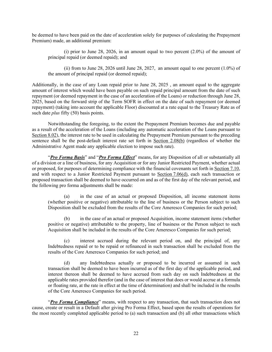 22 be deemed to have been paid on the date of acceleration solely for purposes of calculating the Prepayment Premium) made, an additional premium: (i) prior to June 28, 2026, in an amount equal to two percent (2.0%) of the amount of principal repaid (or deemed repaid); and (ii) from to June 28, 2026 until June 28, 2027, an amount equal to one percent (1.0%) of the amount of principal repaid (or deemed repaid); Additionally, in the case of any Loan repaid prior to June 28, 2025 , an amount equal to the aggregate amount of interest which would have been payable on such repaid principal amount from the date of such repayment (or deemed repayment in the case of an acceleration of the Loans) or reduction through June 28, 2025, based on the forward strip of the Term SOFR in effect on the date of such repayment (or deemed repayment) (taking into account the applicable Floor) discounted at a rate equal to the Treasury Rate as of such date plus fifty (50) basis points. Notwithstanding the foregoing, to the extent the Prepayment Premium becomes due and payable as a result of the acceleration of the Loans (including any automatic acceleration of the Loans pursuant to Section 8.02), the interest rate to be used in calculating the Prepayment Premium pursuant to the preceding sentence shall be the post-default interest rate set forth in Section 2.08(b) (regardless of whether the Administrative Agent made any applicable election to impose such rate). “Pro Forma Basis” and “Pro Forma Effect” means, for any Disposition of all or substantially all of a division or a line of business, for any Acquisition or for any Junior Restricted Payment, whether actual or proposed, for purposes of determining compliance with the financial covenants set forth in Section 7.10, and with respect to a Junior Restricted Payment pursuant to Section 7.06(d), each such transaction or proposed transaction shall be deemed to have occurred on and as of the first day of the relevant period, and the following pro forma adjustments shall be made: (a) in the case of an actual or proposed Disposition, all income statement items (whether positive or negative) attributable to the line of business or the Person subject to such Disposition shall be excluded from the results of the Core Ameresco Companies for such period; (b) in the case of an actual or proposed Acquisition, income statement items (whether positive or negative) attributable to the property, line of business or the Person subject to such Acquisition shall be included in the results of the Core Ameresco Companies for such period; (c) interest accrued during the relevant period on, and the principal of, any Indebtedness repaid or to be repaid or refinanced in such transaction shall be excluded from the results of the Core Ameresco Companies for such period; and (d) any Indebtedness actually or proposed to be incurred or assumed in such transaction shall be deemed to have been incurred as of the first day of the applicable period, and interest thereon shall be deemed to have accrued from such day on such Indebtedness at the applicable rates provided therefor (and in the case of interest that does or would accrue at a formula or floating rate, at the rate in effect at the time of determination) and shall be included in the results of the Core Ameresco Companies for such period. “Pro Forma Compliance” means, with respect to any transaction, that such transaction does not cause, create or result in a Default after giving Pro Forma Effect, based upon the results of operations for the most recently completed applicable period to (a) such transaction and (b) all other transactions which