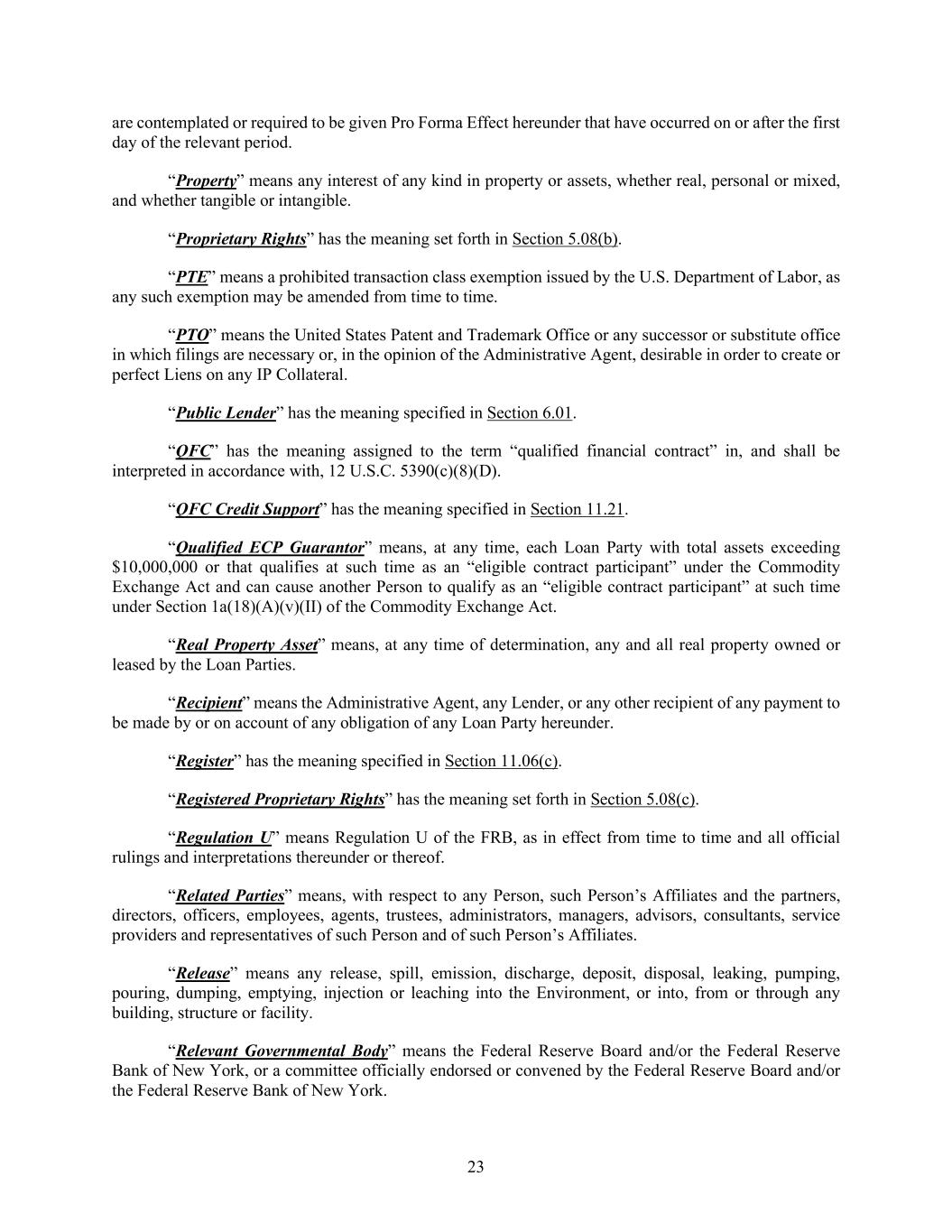 23 are contemplated or required to be given Pro Forma Effect hereunder that have occurred on or after the first day of the relevant period. “Property” means any interest of any kind in property or assets, whether real, personal or mixed, and whether tangible or intangible. “Proprietary Rights” has the meaning set forth in Section 5.08(b). “PTE” means a prohibited transaction class exemption issued by the U.S. Department of Labor, as any such exemption may be amended from time to time. “PTO” means the United States Patent and Trademark Office or any successor or substitute office in which filings are necessary or, in the opinion of the Administrative Agent, desirable in order to create or perfect Liens on any IP Collateral. “Public Lender” has the meaning specified in Section 6.01. “QFC” has the meaning assigned to the term “qualified financial contract” in, and shall be interpreted in accordance with, 12 U.S.C. 5390(c)(8)(D). “QFC Credit Support” has the meaning specified in Section 11.21. “Qualified ECP Guarantor” means, at any time, each Loan Party with total assets exceeding $10,000,000 or that qualifies at such time as an “eligible contract participant” under the Commodity Exchange Act and can cause another Person to qualify as an “eligible contract participant” at such time under Section 1a(18)(A)(v)(II) of the Commodity Exchange Act. “Real Property Asset” means, at any time of determination, any and all real property owned or leased by the Loan Parties. “Recipient” means the Administrative Agent, any Lender, or any other recipient of any payment to be made by or on account of any obligation of any Loan Party hereunder. “Register” has the meaning specified in Section 11.06(c). “Registered Proprietary Rights” has the meaning set forth in Section 5.08(c). “Regulation U” means Regulation U of the FRB, as in effect from time to time and all official rulings and interpretations thereunder or thereof. “Related Parties” means, with respect to any Person, such Person’s Affiliates and the partners, directors, officers, employees, agents, trustees, administrators, managers, advisors, consultants, service providers and representatives of such Person and of such Person’s Affiliates. “Release” means any release, spill, emission, discharge, deposit, disposal, leaking, pumping, pouring, dumping, emptying, injection or leaching into the Environment, or into, from or through any building, structure or facility. “Relevant Governmental Body” means the Federal Reserve Board and/or the Federal Reserve Bank of New York, or a committee officially endorsed or convened by the Federal Reserve Board and/or the Federal Reserve Bank of New York.