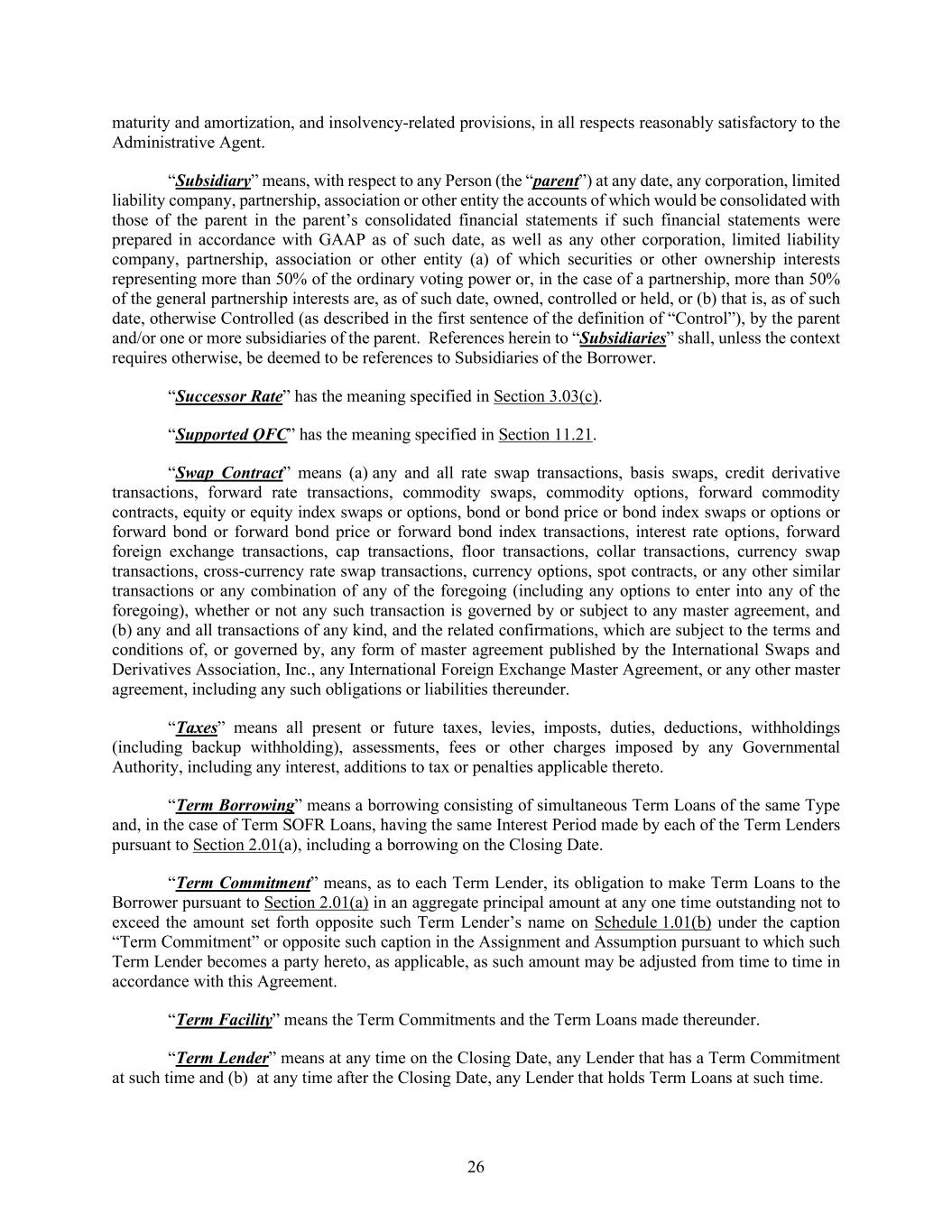 26 maturity and amortization, and insolvency-related provisions, in all respects reasonably satisfactory to the Administrative Agent. “Subsidiary” means, with respect to any Person (the “parent”) at any date, any corporation, limited liability company, partnership, association or other entity the accounts of which would be consolidated with those of the parent in the parent’s consolidated financial statements if such financial statements were prepared in accordance with GAAP as of such date, as well as any other corporation, limited liability company, partnership, association or other entity (a) of which securities or other ownership interests representing more than 50% of the ordinary voting power or, in the case of a partnership, more than 50% of the general partnership interests are, as of such date, owned, controlled or held, or (b) that is, as of such date, otherwise Controlled (as described in the first sentence of the definition of “Control”), by the parent and/or one or more subsidiaries of the parent. References herein to “Subsidiaries” shall, unless the context requires otherwise, be deemed to be references to Subsidiaries of the Borrower. “Successor Rate” has the meaning specified in Section 3.03(c). “Supported QFC” has the meaning specified in Section 11.21. “Swap Contract” means (a) any and all rate swap transactions, basis swaps, credit derivative transactions, forward rate transactions, commodity swaps, commodity options, forward commodity contracts, equity or equity index swaps or options, bond or bond price or bond index swaps or options or forward bond or forward bond price or forward bond index transactions, interest rate options, forward foreign exchange transactions, cap transactions, floor transactions, collar transactions, currency swap transactions, cross-currency rate swap transactions, currency options, spot contracts, or any other similar transactions or any combination of any of the foregoing (including any options to enter into any of the foregoing), whether or not any such transaction is governed by or subject to any master agreement, and (b) any and all transactions of any kind, and the related confirmations, which are subject to the terms and conditions of, or governed by, any form of master agreement published by the International Swaps and Derivatives Association, Inc., any International Foreign Exchange Master Agreement, or any other master agreement, including any such obligations or liabilities thereunder. “Taxes” means all present or future taxes, levies, imposts, duties, deductions, withholdings (including backup withholding), assessments, fees or other charges imposed by any Governmental Authority, including any interest, additions to tax or penalties applicable thereto. “Term Borrowing” means a borrowing consisting of simultaneous Term Loans of the same Type and, in the case of Term SOFR Loans, having the same Interest Period made by each of the Term Lenders pursuant to Section 2.01(a), including a borrowing on the Closing Date. “Term Commitment” means, as to each Term Lender, its obligation to make Term Loans to the Borrower pursuant to Section 2.01(a) in an aggregate principal amount at any one time outstanding not to exceed the amount set forth opposite such Term Lender’s name on Schedule 1.01(b) under the caption “Term Commitment” or opposite such caption in the Assignment and Assumption pursuant to which such Term Lender becomes a party hereto, as applicable, as such amount may be adjusted from time to time in accordance with this Agreement. “Term Facility” means the Term Commitments and the Term Loans made thereunder. “Term Lender” means at any time on the Closing Date, any Lender that has a Term Commitment at such time and (b) at any time after the Closing Date, any Lender that holds Term Loans at such time.
