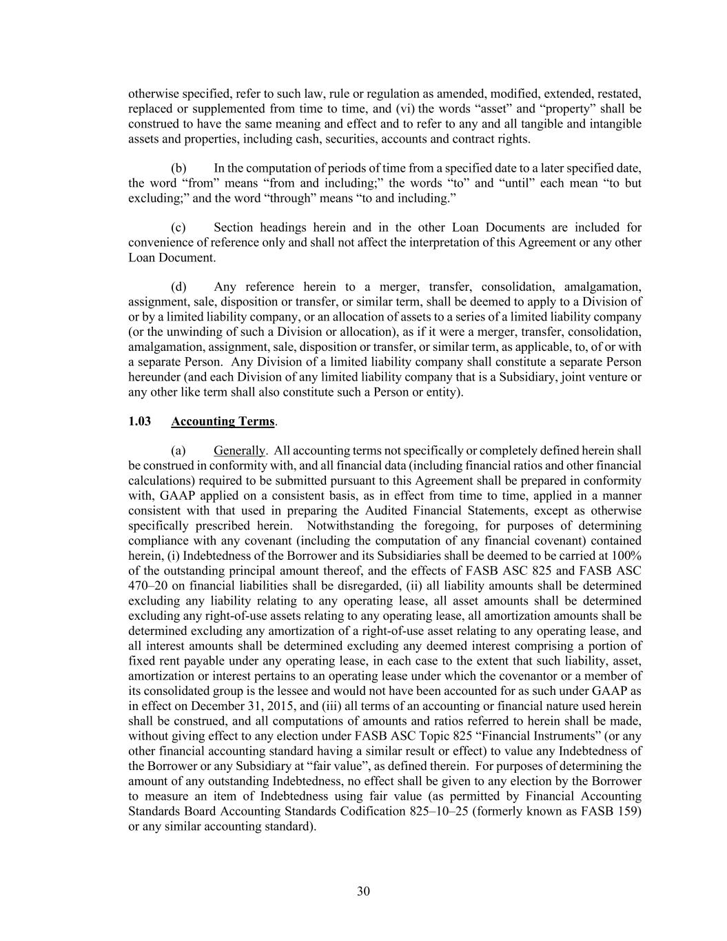 30 otherwise specified, refer to such law, rule or regulation as amended, modified, extended, restated, replaced or supplemented from time to time, and (vi) the words “asset” and “property” shall be construed to have the same meaning and effect and to refer to any and all tangible and intangible assets and properties, including cash, securities, accounts and contract rights. (b) In the computation of periods of time from a specified date to a later specified date, the word “from” means “from and including;” the words “to” and “until” each mean “to but excluding;” and the word “through” means “to and including.” (c) Section headings herein and in the other Loan Documents are included for convenience of reference only and shall not affect the interpretation of this Agreement or any other Loan Document. (d) Any reference herein to a merger, transfer, consolidation, amalgamation, assignment, sale, disposition or transfer, or similar term, shall be deemed to apply to a Division of or by a limited liability company, or an allocation of assets to a series of a limited liability company (or the unwinding of such a Division or allocation), as if it were a merger, transfer, consolidation, amalgamation, assignment, sale, disposition or transfer, or similar term, as applicable, to, of or with a separate Person. Any Division of a limited liability company shall constitute a separate Person hereunder (and each Division of any limited liability company that is a Subsidiary, joint venture or any other like term shall also constitute such a Person or entity). 1.03 Accounting Terms. (a) Generally. All accounting terms not specifically or completely defined herein shall be construed in conformity with, and all financial data (including financial ratios and other financial calculations) required to be submitted pursuant to this Agreement shall be prepared in conformity with, GAAP applied on a consistent basis, as in effect from time to time, applied in a manner consistent with that used in preparing the Audited Financial Statements, except as otherwise specifically prescribed herein. Notwithstanding the foregoing, for purposes of determining compliance with any covenant (including the computation of any financial covenant) contained herein, (i) Indebtedness of the Borrower and its Subsidiaries shall be deemed to be carried at 100% of the outstanding principal amount thereof, and the effects of FASB ASC 825 and FASB ASC 470–20 on financial liabilities shall be disregarded, (ii) all liability amounts shall be determined excluding any liability relating to any operating lease, all asset amounts shall be determined excluding any right-of-use assets relating to any operating lease, all amortization amounts shall be determined excluding any amortization of a right-of-use asset relating to any operating lease, and all interest amounts shall be determined excluding any deemed interest comprising a portion of fixed rent payable under any operating lease, in each case to the extent that such liability, asset, amortization or interest pertains to an operating lease under which the covenantor or a member of its consolidated group is the lessee and would not have been accounted for as such under GAAP as in effect on December 31, 2015, and (iii) all terms of an accounting or financial nature used herein shall be construed, and all computations of amounts and ratios referred to herein shall be made, without giving effect to any election under FASB ASC Topic 825 “Financial Instruments” (or any other financial accounting standard having a similar result or effect) to value any Indebtedness of the Borrower or any Subsidiary at “fair value”, as defined therein. For purposes of determining the amount of any outstanding Indebtedness, no effect shall be given to any election by the Borrower to measure an item of Indebtedness using fair value (as permitted by Financial Accounting Standards Board Accounting Standards Codification 825–10–25 (formerly known as FASB 159) or any similar accounting standard).