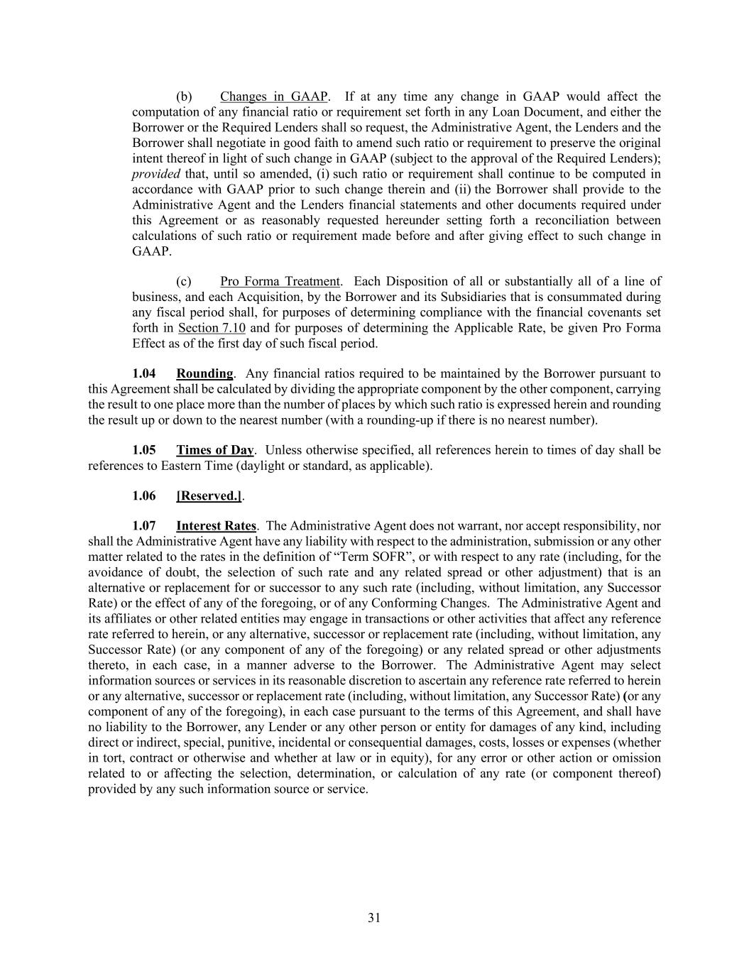 31 (b) Changes in GAAP. If at any time any change in GAAP would affect the computation of any financial ratio or requirement set forth in any Loan Document, and either the Borrower or the Required Lenders shall so request, the Administrative Agent, the Lenders and the Borrower shall negotiate in good faith to amend such ratio or requirement to preserve the original intent thereof in light of such change in GAAP (subject to the approval of the Required Lenders); provided that, until so amended, (i) such ratio or requirement shall continue to be computed in accordance with GAAP prior to such change therein and (ii) the Borrower shall provide to the Administrative Agent and the Lenders financial statements and other documents required under this Agreement or as reasonably requested hereunder setting forth a reconciliation between calculations of such ratio or requirement made before and after giving effect to such change in GAAP. (c) Pro Forma Treatment. Each Disposition of all or substantially all of a line of business, and each Acquisition, by the Borrower and its Subsidiaries that is consummated during any fiscal period shall, for purposes of determining compliance with the financial covenants set forth in Section 7.10 and for purposes of determining the Applicable Rate, be given Pro Forma Effect as of the first day of such fiscal period. 1.04 Rounding. Any financial ratios required to be maintained by the Borrower pursuant to this Agreement shall be calculated by dividing the appropriate component by the other component, carrying the result to one place more than the number of places by which such ratio is expressed herein and rounding the result up or down to the nearest number (with a rounding-up if there is no nearest number). 1.05 Times of Day. Unless otherwise specified, all references herein to times of day shall be references to Eastern Time (daylight or standard, as applicable). 1.06 [Reserved.]. 1.07 Interest Rates. The Administrative Agent does not warrant, nor accept responsibility, nor shall the Administrative Agent have any liability with respect to the administration, submission or any other matter related to the rates in the definition of “Term SOFR”, or with respect to any rate (including, for the avoidance of doubt, the selection of such rate and any related spread or other adjustment) that is an alternative or replacement for or successor to any such rate (including, without limitation, any Successor Rate) or the effect of any of the foregoing, or of any Conforming Changes. The Administrative Agent and its affiliates or other related entities may engage in transactions or other activities that affect any reference rate referred to herein, or any alternative, successor or replacement rate (including, without limitation, any Successor Rate) (or any component of any of the foregoing) or any related spread or other adjustments thereto, in each case, in a manner adverse to the Borrower. The Administrative Agent may select information sources or services in its reasonable discretion to ascertain any reference rate referred to herein or any alternative, successor or replacement rate (including, without limitation, any Successor Rate) (or any component of any of the foregoing), in each case pursuant to the terms of this Agreement, and shall have no liability to the Borrower, any Lender or any other person or entity for damages of any kind, including direct or indirect, special, punitive, incidental or consequential damages, costs, losses or expenses (whether in tort, contract or otherwise and whether at law or in equity), for any error or other action or omission related to or affecting the selection, determination, or calculation of any rate (or component thereof) provided by any such information source or service.