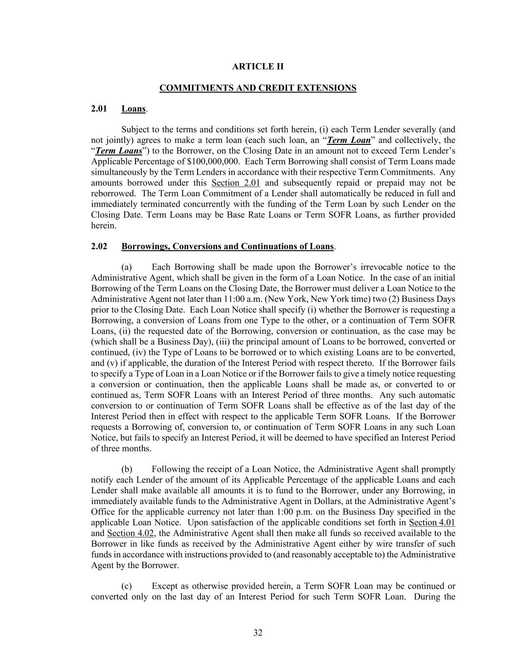 32 ARTICLE II COMMITMENTS AND CREDIT EXTENSIONS 2.01 Loans. Subject to the terms and conditions set forth herein, (i) each Term Lender severally (and not jointly) agrees to make a term loan (each such loan, an “Term Loan” and collectively, the “Term Loans”) to the Borrower, on the Closing Date in an amount not to exceed Term Lender’s Applicable Percentage of $100,000,000. Each Term Borrowing shall consist of Term Loans made simultaneously by the Term Lenders in accordance with their respective Term Commitments. Any amounts borrowed under this Section 2.01 and subsequently repaid or prepaid may not be reborrowed. The Term Loan Commitment of a Lender shall automatically be reduced in full and immediately terminated concurrently with the funding of the Term Loan by such Lender on the Closing Date. Term Loans may be Base Rate Loans or Term SOFR Loans, as further provided herein. 2.02 Borrowings, Conversions and Continuations of Loans. (a) Each Borrowing shall be made upon the Borrower’s irrevocable notice to the Administrative Agent, which shall be given in the form of a Loan Notice. In the case of an initial Borrowing of the Term Loans on the Closing Date, the Borrower must deliver a Loan Notice to the Administrative Agent not later than 11:00 a.m. (New York, New York time) two (2) Business Days prior to the Closing Date. Each Loan Notice shall specify (i) whether the Borrower is requesting a Borrowing, a conversion of Loans from one Type to the other, or a continuation of Term SOFR Loans, (ii) the requested date of the Borrowing, conversion or continuation, as the case may be (which shall be a Business Day), (iii) the principal amount of Loans to be borrowed, converted or continued, (iv) the Type of Loans to be borrowed or to which existing Loans are to be converted, and (v) if applicable, the duration of the Interest Period with respect thereto. If the Borrower fails to specify a Type of Loan in a Loan Notice or if the Borrower fails to give a timely notice requesting a conversion or continuation, then the applicable Loans shall be made as, or converted to or continued as, Term SOFR Loans with an Interest Period of three months. Any such automatic conversion to or continuation of Term SOFR Loans shall be effective as of the last day of the Interest Period then in effect with respect to the applicable Term SOFR Loans. If the Borrower requests a Borrowing of, conversion to, or continuation of Term SOFR Loans in any such Loan Notice, but fails to specify an Interest Period, it will be deemed to have specified an Interest Period of three months. (b) Following the receipt of a Loan Notice, the Administrative Agent shall promptly notify each Lender of the amount of its Applicable Percentage of the applicable Loans and each Lender shall make available all amounts it is to fund to the Borrower, under any Borrowing, in immediately available funds to the Administrative Agent in Dollars, at the Administrative Agent’s Office for the applicable currency not later than 1:00 p.m. on the Business Day specified in the applicable Loan Notice. Upon satisfaction of the applicable conditions set forth in Section 4.01 and Section 4.02, the Administrative Agent shall then make all funds so received available to the Borrower in like funds as received by the Administrative Agent either by wire transfer of such funds in accordance with instructions provided to (and reasonably acceptable to) the Administrative Agent by the Borrower. (c) Except as otherwise provided herein, a Term SOFR Loan may be continued or converted only on the last day of an Interest Period for such Term SOFR Loan. During the