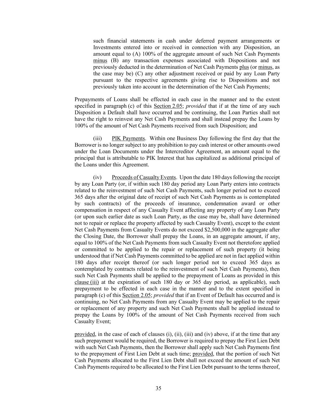 35 such financial statements in cash under deferred payment arrangements or Investments entered into or received in connection with any Disposition, an amount equal to (A) 100% of the aggregate amount of such Net Cash Payments minus (B) any transaction expenses associated with Dispositions and not previously deducted in the determination of Net Cash Payments plus (or minus, as the case may be) (C) any other adjustment received or paid by any Loan Party pursuant to the respective agreements giving rise to Dispositions and not previously taken into account in the determination of the Net Cash Payments; Prepayments of Loans shall be effected in each case in the manner and to the extent specified in paragraph (c) of this Section 2.05; provided that if at the time of any such Disposition a Default shall have occurred and be continuing, the Loan Parties shall not have the right to reinvest any Net Cash Payments and shall instead prepay the Loans by 100% of the amount of Net Cash Payments received from such Disposition; and (iii) PIK Payments. Within one Business Day following the first day that the Borrower is no longer subject to any prohibition to pay cash interest or other amounts owed under the Loan Documents under the Intercreditor Agreement, an amount equal to the principal that is attributable to PIK Interest that has capitalized as additional principal of the Loans under this Agreement. (iv) Proceeds of Casualty Events. Upon the date 180 days following the receipt by any Loan Party (or, if within such 180 day period any Loan Party enters into contracts related to the reinvestment of such Net Cash Payments, such longer period not to exceed 365 days after the original date of receipt of such Net Cash Payments as is contemplated by such contracts) of the proceeds of insurance, condemnation award or other compensation in respect of any Casualty Event affecting any property of any Loan Party (or upon such earlier date as such Loan Party, as the case may be, shall have determined not to repair or replace the property affected by such Casualty Event), except to the extent Net Cash Payments from Casualty Events do not exceed $2,500,000 in the aggregate after the Closing Date, the Borrower shall prepay the Loans, in an aggregate amount, if any, equal to 100% of the Net Cash Payments from such Casualty Event not theretofore applied or committed to be applied to the repair or replacement of such property (it being understood that if Net Cash Payments committed to be applied are not in fact applied within 180 days after receipt thereof (or such longer period not to exceed 365 days as contemplated by contracts related to the reinvestment of such Net Cash Payments), then such Net Cash Payments shall be applied to the prepayment of Loans as provided in this clause (iii) at the expiration of such 180 day or 365 day period, as applicable), such prepayment to be effected in each case in the manner and to the extent specified in paragraph (c) of this Section 2.05; provided that if an Event of Default has occurred and is continuing, no Net Cash Payments from any Casualty Event may be applied to the repair or replacement of any property and such Net Cash Payments shall be applied instead to prepay the Loans by 100% of the amount of Net Cash Payments received from such Casualty Event; provided, in the case of each of clauses (i), (ii), (iii) and (iv) above, if at the time that any such prepayment would be required, the Borrower is required to prepay the First Lien Debt with such Net Cash Payments, then the Borrower shall apply such Net Cash Payments first to the prepayment of First Lien Debt at such time; provided, that the portion of such Net Cash Payments allocated to the First Lien Debt shall not exceed the amount of such Net Cash Payments required to be allocated to the First Lien Debt pursuant to the terms thereof,