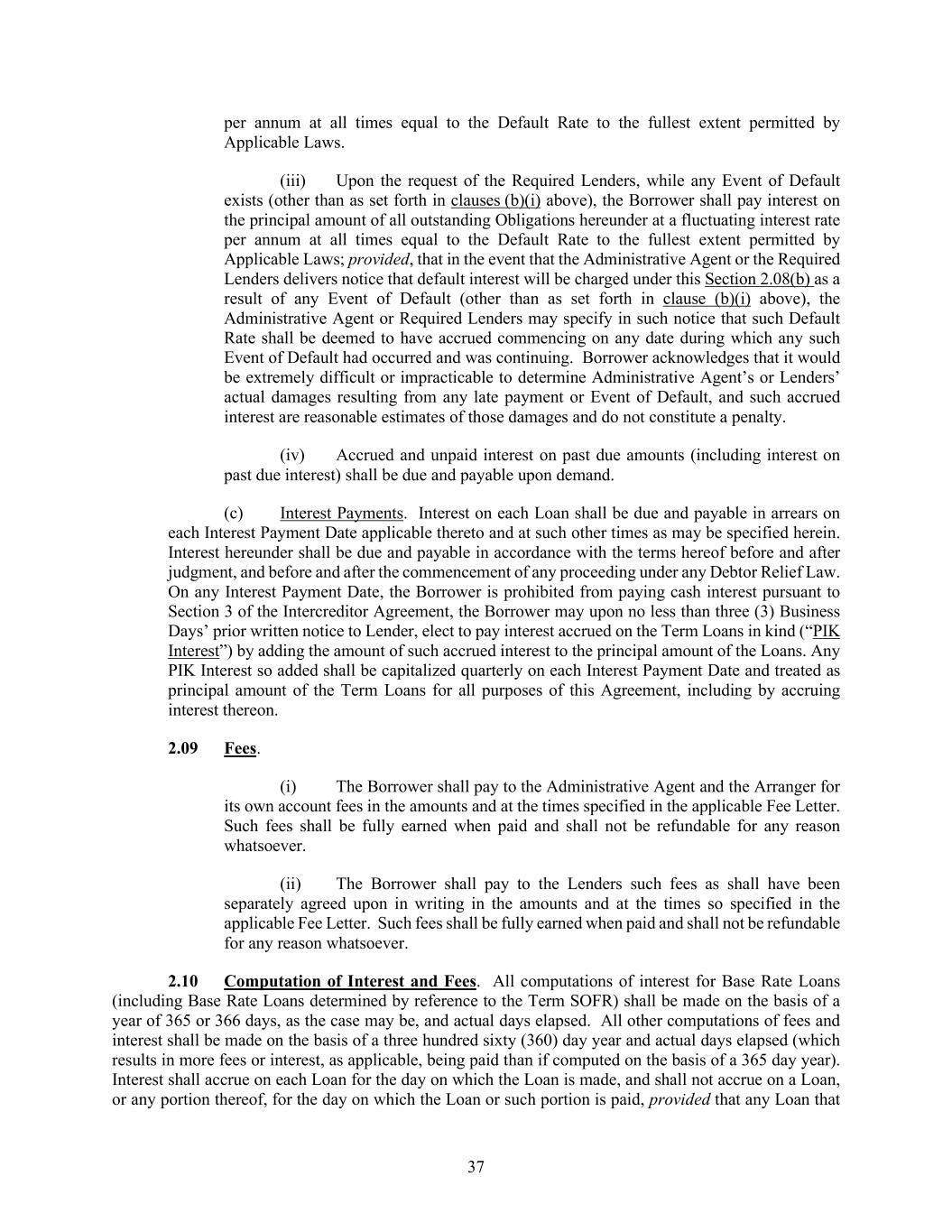 37 per annum at all times equal to the Default Rate to the fullest extent permitted by Applicable Laws. (iii) Upon the request of the Required Lenders, while any Event of Default exists (other than as set forth in clauses (b)(i) above), the Borrower shall pay interest on the principal amount of all outstanding Obligations hereunder at a fluctuating interest rate per annum at all times equal to the Default Rate to the fullest extent permitted by Applicable Laws; provided, that in the event that the Administrative Agent or the Required Lenders delivers notice that default interest will be charged under this Section 2.08(b) as a result of any Event of Default (other than as set forth in clause (b)(i) above), the Administrative Agent or Required Lenders may specify in such notice that such Default Rate shall be deemed to have accrued commencing on any date during which any such Event of Default had occurred and was continuing. Borrower acknowledges that it would be extremely difficult or impracticable to determine Administrative Agent’s or Lenders’ actual damages resulting from any late payment or Event of Default, and such accrued interest are reasonable estimates of those damages and do not constitute a penalty. (iv) Accrued and unpaid interest on past due amounts (including interest on past due interest) shall be due and payable upon demand. (c) Interest Payments. Interest on each Loan shall be due and payable in arrears on each Interest Payment Date applicable thereto and at such other times as may be specified herein. Interest hereunder shall be due and payable in accordance with the terms hereof before and after judgment, and before and after the commencement of any proceeding under any Debtor Relief Law. On any Interest Payment Date, the Borrower is prohibited from paying cash interest pursuant to Section 3 of the Intercreditor Agreement, the Borrower may upon no less than three (3) Business Days’ prior written notice to Lender, elect to pay interest accrued on the Term Loans in kind (“PIK Interest”) by adding the amount of such accrued interest to the principal amount of the Loans. Any PIK Interest so added shall be capitalized quarterly on each Interest Payment Date and treated as principal amount of the Term Loans for all purposes of this Agreement, including by accruing interest thereon. 2.09 Fees. (i) The Borrower shall pay to the Administrative Agent and the Arranger for its own account fees in the amounts and at the times specified in the applicable Fee Letter. Such fees shall be fully earned when paid and shall not be refundable for any reason whatsoever. (ii) The Borrower shall pay to the Lenders such fees as shall have been separately agreed upon in writing in the amounts and at the times so specified in the applicable Fee Letter. Such fees shall be fully earned when paid and shall not be refundable for any reason whatsoever. 2.10 Computation of Interest and Fees. All computations of interest for Base Rate Loans (including Base Rate Loans determined by reference to the Term SOFR) shall be made on the basis of a year of 365 or 366 days, as the case may be, and actual days elapsed. All other computations of fees and interest shall be made on the basis of a three hundred sixty (360) day year and actual days elapsed (which results in more fees or interest, as applicable, being paid than if computed on the basis of a 365 day year). Interest shall accrue on each Loan for the day on which the Loan is made, and shall not accrue on a Loan, or any portion thereof, for the day on which the Loan or such portion is paid, provided that any Loan that
