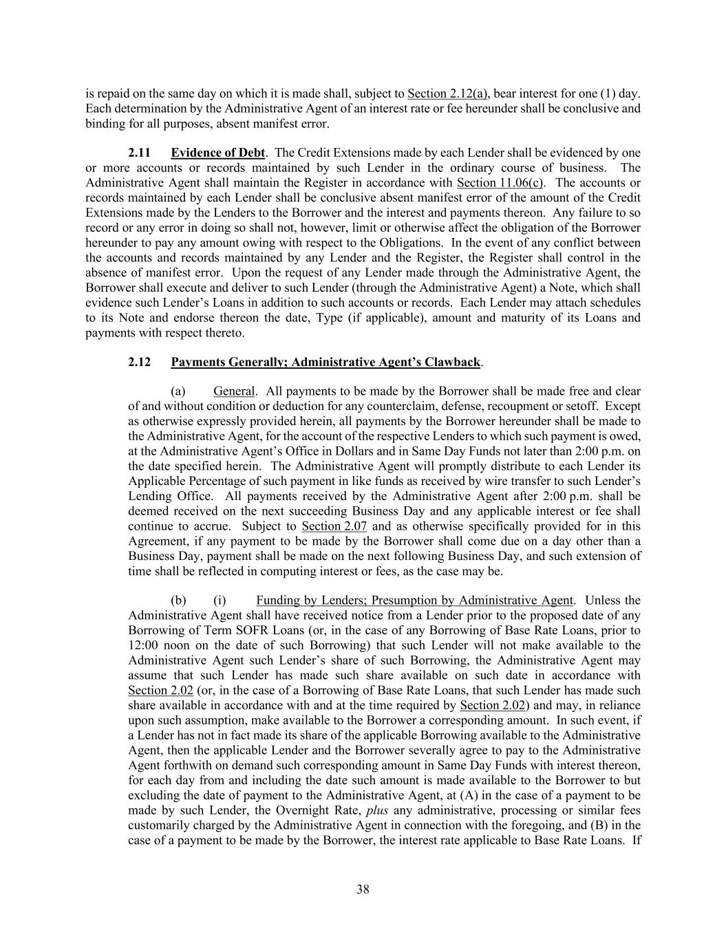 38 is repaid on the same day on which it is made shall, subject to Section 2.12(a), bear interest for one (1) day. Each determination by the Administrative Agent of an interest rate or fee hereunder shall be conclusive and binding for all purposes, absent manifest error. 2.11 Evidence of Debt. The Credit Extensions made by each Lender shall be evidenced by one or more accounts or records maintained by such Lender in the ordinary course of business. The Administrative Agent shall maintain the Register in accordance with Section 11.06(c). The accounts or records maintained by each Lender shall be conclusive absent manifest error of the amount of the Credit Extensions made by the Lenders to the Borrower and the interest and payments thereon. Any failure to so record or any error in doing so shall not, however, limit or otherwise affect the obligation of the Borrower hereunder to pay any amount owing with respect to the Obligations. In the event of any conflict between the accounts and records maintained by any Lender and the Register, the Register shall control in the absence of manifest error. Upon the request of any Lender made through the Administrative Agent, the Borrower shall execute and deliver to such Lender (through the Administrative Agent) a Note, which shall evidence such Lender’s Loans in addition to such accounts or records. Each Lender may attach schedules to its Note and endorse thereon the date, Type (if applicable), amount and maturity of its Loans and payments with respect thereto. 2.12 Payments Generally; Administrative Agent’s Clawback. (a) General. All payments to be made by the Borrower shall be made free and clear of and without condition or deduction for any counterclaim, defense, recoupment or setoff. Except as otherwise expressly provided herein, all payments by the Borrower hereunder shall be made to the Administrative Agent, for the account of the respective Lenders to which such payment is owed, at the Administrative Agent’s Office in Dollars and in Same Day Funds not later than 2:00 p.m. on the date specified herein. The Administrative Agent will promptly distribute to each Lender its Applicable Percentage of such payment in like funds as received by wire transfer to such Lender’s Lending Office. All payments received by the Administrative Agent after 2:00 p.m. shall be deemed received on the next succeeding Business Day and any applicable interest or fee shall continue to accrue. Subject to Section 2.07 and as otherwise specifically provided for in this Agreement, if any payment to be made by the Borrower shall come due on a day other than a Business Day, payment shall be made on the next following Business Day, and such extension of time shall be reflected in computing interest or fees, as the case may be. (b) (i) Funding by Lenders; Presumption by Administrative Agent. Unless the Administrative Agent shall have received notice from a Lender prior to the proposed date of any Borrowing of Term SOFR Loans (or, in the case of any Borrowing of Base Rate Loans, prior to 12:00 noon on the date of such Borrowing) that such Lender will not make available to the Administrative Agent such Lender’s share of such Borrowing, the Administrative Agent may assume that such Lender has made such share available on such date in accordance with Section 2.02 (or, in the case of a Borrowing of Base Rate Loans, that such Lender has made such share available in accordance with and at the time required by Section 2.02) and may, in reliance upon such assumption, make available to the Borrower a corresponding amount. In such event, if a Lender has not in fact made its share of the applicable Borrowing available to the Administrative Agent, then the applicable Lender and the Borrower severally agree to pay to the Administrative Agent forthwith on demand such corresponding amount in Same Day Funds with interest thereon, for each day from and including the date such amount is made available to the Borrower to but excluding the date of payment to the Administrative Agent, at (A) in the case of a payment to be made by such Lender, the Overnight Rate, plus any administrative, processing or similar fees customarily charged by the Administrative Agent in connection with the foregoing, and (B) in the case of a payment to be made by the Borrower, the interest rate applicable to Base Rate Loans. If