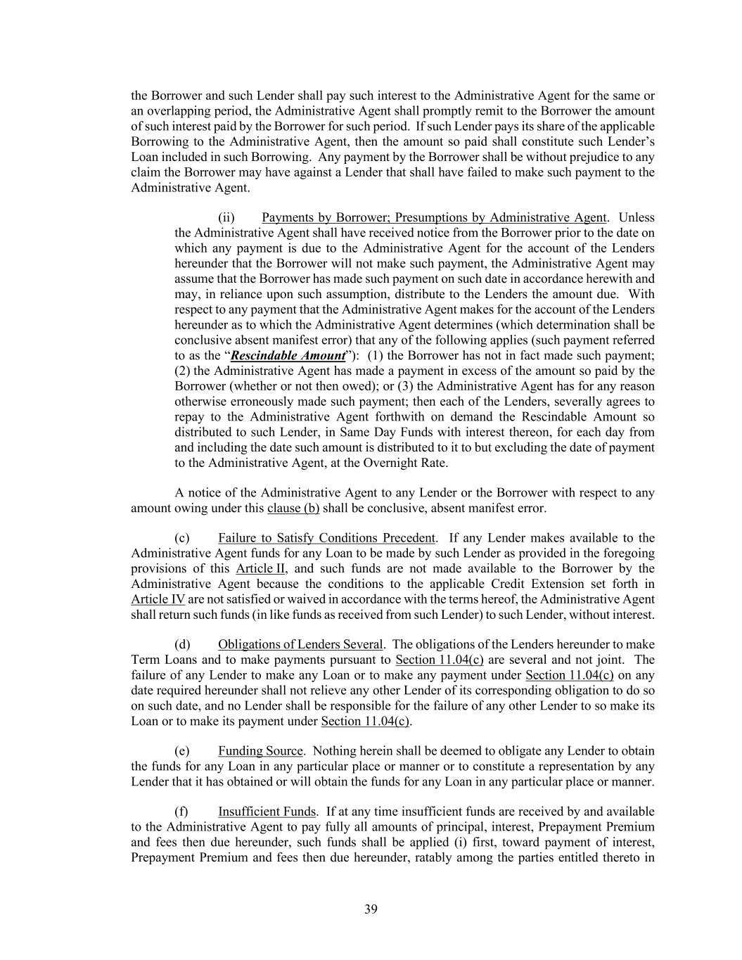 39 the Borrower and such Lender shall pay such interest to the Administrative Agent for the same or an overlapping period, the Administrative Agent shall promptly remit to the Borrower the amount of such interest paid by the Borrower for such period. If such Lender pays its share of the applicable Borrowing to the Administrative Agent, then the amount so paid shall constitute such Lender’s Loan included in such Borrowing. Any payment by the Borrower shall be without prejudice to any claim the Borrower may have against a Lender that shall have failed to make such payment to the Administrative Agent. (ii) Payments by Borrower; Presumptions by Administrative Agent. Unless the Administrative Agent shall have received notice from the Borrower prior to the date on which any payment is due to the Administrative Agent for the account of the Lenders hereunder that the Borrower will not make such payment, the Administrative Agent may assume that the Borrower has made such payment on such date in accordance herewith and may, in reliance upon such assumption, distribute to the Lenders the amount due. With respect to any payment that the Administrative Agent makes for the account of the Lenders hereunder as to which the Administrative Agent determines (which determination shall be conclusive absent manifest error) that any of the following applies (such payment referred to as the “Rescindable Amount”): (1) the Borrower has not in fact made such payment; (2) the Administrative Agent has made a payment in excess of the amount so paid by the Borrower (whether or not then owed); or (3) the Administrative Agent has for any reason otherwise erroneously made such payment; then each of the Lenders, severally agrees to repay to the Administrative Agent forthwith on demand the Rescindable Amount so distributed to such Lender, in Same Day Funds with interest thereon, for each day from and including the date such amount is distributed to it to but excluding the date of payment to the Administrative Agent, at the Overnight Rate. A notice of the Administrative Agent to any Lender or the Borrower with respect to any amount owing under this clause (b) shall be conclusive, absent manifest error. (c) Failure to Satisfy Conditions Precedent. If any Lender makes available to the Administrative Agent funds for any Loan to be made by such Lender as provided in the foregoing provisions of this Article II, and such funds are not made available to the Borrower by the Administrative Agent because the conditions to the applicable Credit Extension set forth in Article IV are not satisfied or waived in accordance with the terms hereof, the Administrative Agent shall return such funds (in like funds as received from such Lender) to such Lender, without interest. (d) Obligations of Lenders Several. The obligations of the Lenders hereunder to make Term Loans and to make payments pursuant to Section 11.04(c) are several and not joint. The failure of any Lender to make any Loan or to make any payment under Section 11.04(c) on any date required hereunder shall not relieve any other Lender of its corresponding obligation to do so on such date, and no Lender shall be responsible for the failure of any other Lender to so make its Loan or to make its payment under Section 11.04(c). (e) Funding Source. Nothing herein shall be deemed to obligate any Lender to obtain the funds for any Loan in any particular place or manner or to constitute a representation by any Lender that it has obtained or will obtain the funds for any Loan in any particular place or manner. (f) Insufficient Funds. If at any time insufficient funds are received by and available to the Administrative Agent to pay fully all amounts of principal, interest, Prepayment Premium and fees then due hereunder, such funds shall be applied (i) first, toward payment of interest, Prepayment Premium and fees then due hereunder, ratably among the parties entitled thereto in