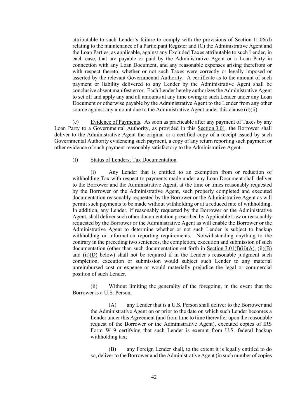 42 attributable to such Lender’s failure to comply with the provisions of Section 11.06(d) relating to the maintenance of a Participant Register and (C) the Administrative Agent and the Loan Parties, as applicable, against any Excluded Taxes attributable to such Lender, in each case, that are payable or paid by the Administrative Agent or a Loan Party in connection with any Loan Document, and any reasonable expenses arising therefrom or with respect thereto, whether or not such Taxes were correctly or legally imposed or asserted by the relevant Governmental Authority. A certificate as to the amount of such payment or liability delivered to any Lender by the Administrative Agent shall be conclusive absent manifest error. Each Lender hereby authorizes the Administrative Agent to set off and apply any and all amounts at any time owing to such Lender under any Loan Document or otherwise payable by the Administrative Agent to the Lender from any other source against any amount due to the Administrative Agent under this clause (d)(ii). (e) Evidence of Payments. As soon as practicable after any payment of Taxes by any Loan Party to a Governmental Authority, as provided in this Section 3.01, the Borrower shall deliver to the Administrative Agent the original or a certified copy of a receipt issued by such Governmental Authority evidencing such payment, a copy of any return reporting such payment or other evidence of such payment reasonably satisfactory to the Administrative Agent. (f) Status of Lenders; Tax Documentation. (i) Any Lender that is entitled to an exemption from or reduction of withholding Tax with respect to payments made under any Loan Document shall deliver to the Borrower and the Administrative Agent, at the time or times reasonably requested by the Borrower or the Administrative Agent, such properly completed and executed documentation reasonably requested by the Borrower or the Administrative Agent as will permit such payments to be made without withholding or at a reduced rate of withholding. In addition, any Lender, if reasonably requested by the Borrower or the Administrative Agent, shall deliver such other documentation prescribed by Applicable Law or reasonably requested by the Borrower or the Administrative Agent as will enable the Borrower or the Administrative Agent to determine whether or not such Lender is subject to backup withholding or information reporting requirements. Notwithstanding anything to the contrary in the preceding two sentences, the completion, execution and submission of such documentation (other than such documentation set forth in Section 3.01(f)(ii)(A), (ii)(B) and (ii)(D) below) shall not be required if in the Lender’s reasonable judgment such completion, execution or submission would subject such Lender to any material unreimbursed cost or expense or would materially prejudice the legal or commercial position of such Lender. (ii) Without limiting the generality of the foregoing, in the event that the Borrower is a U.S. Person, (A) any Lender that is a U.S. Person shall deliver to the Borrower and the Administrative Agent on or prior to the date on which such Lender becomes a Lender under this Agreement (and from time to time thereafter upon the reasonable request of the Borrower or the Administrative Agent), executed copies of IRS Form W–9 certifying that such Lender is exempt from U.S. federal backup withholding tax; (B) any Foreign Lender shall, to the extent it is legally entitled to do so, deliver to the Borrower and the Administrative Agent (in such number of copies