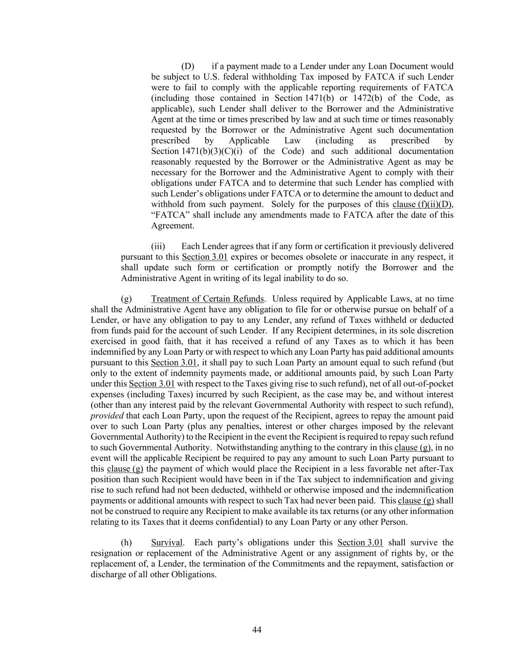 44 (D) if a payment made to a Lender under any Loan Document would be subject to U.S. federal withholding Tax imposed by FATCA if such Lender were to fail to comply with the applicable reporting requirements of FATCA (including those contained in Section 1471(b) or 1472(b) of the Code, as applicable), such Lender shall deliver to the Borrower and the Administrative Agent at the time or times prescribed by law and at such time or times reasonably requested by the Borrower or the Administrative Agent such documentation prescribed by Applicable Law (including as prescribed by Section 1471(b)(3)(C)(i) of the Code) and such additional documentation reasonably requested by the Borrower or the Administrative Agent as may be necessary for the Borrower and the Administrative Agent to comply with their obligations under FATCA and to determine that such Lender has complied with such Lender’s obligations under FATCA or to determine the amount to deduct and withhold from such payment. Solely for the purposes of this clause (f)(ii)(D), “FATCA” shall include any amendments made to FATCA after the date of this Agreement. (iii) Each Lender agrees that if any form or certification it previously delivered pursuant to this Section 3.01 expires or becomes obsolete or inaccurate in any respect, it shall update such form or certification or promptly notify the Borrower and the Administrative Agent in writing of its legal inability to do so. (g) Treatment of Certain Refunds. Unless required by Applicable Laws, at no time shall the Administrative Agent have any obligation to file for or otherwise pursue on behalf of a Lender, or have any obligation to pay to any Lender, any refund of Taxes withheld or deducted from funds paid for the account of such Lender. If any Recipient determines, in its sole discretion exercised in good faith, that it has received a refund of any Taxes as to which it has been indemnified by any Loan Party or with respect to which any Loan Party has paid additional amounts pursuant to this Section 3.01, it shall pay to such Loan Party an amount equal to such refund (but only to the extent of indemnity payments made, or additional amounts paid, by such Loan Party under this Section 3.01 with respect to the Taxes giving rise to such refund), net of all out-of-pocket expenses (including Taxes) incurred by such Recipient, as the case may be, and without interest (other than any interest paid by the relevant Governmental Authority with respect to such refund), provided that each Loan Party, upon the request of the Recipient, agrees to repay the amount paid over to such Loan Party (plus any penalties, interest or other charges imposed by the relevant Governmental Authority) to the Recipient in the event the Recipient is required to repay such refund to such Governmental Authority. Notwithstanding anything to the contrary in this clause (g), in no event will the applicable Recipient be required to pay any amount to such Loan Party pursuant to this clause (g) the payment of which would place the Recipient in a less favorable net after-Tax position than such Recipient would have been in if the Tax subject to indemnification and giving rise to such refund had not been deducted, withheld or otherwise imposed and the indemnification payments or additional amounts with respect to such Tax had never been paid. This clause (g) shall not be construed to require any Recipient to make available its tax returns (or any other information relating to its Taxes that it deems confidential) to any Loan Party or any other Person. (h) Survival. Each party’s obligations under this Section 3.01 shall survive the resignation or replacement of the Administrative Agent or any assignment of rights by, or the replacement of, a Lender, the termination of the Commitments and the repayment, satisfaction or discharge of all other Obligations.