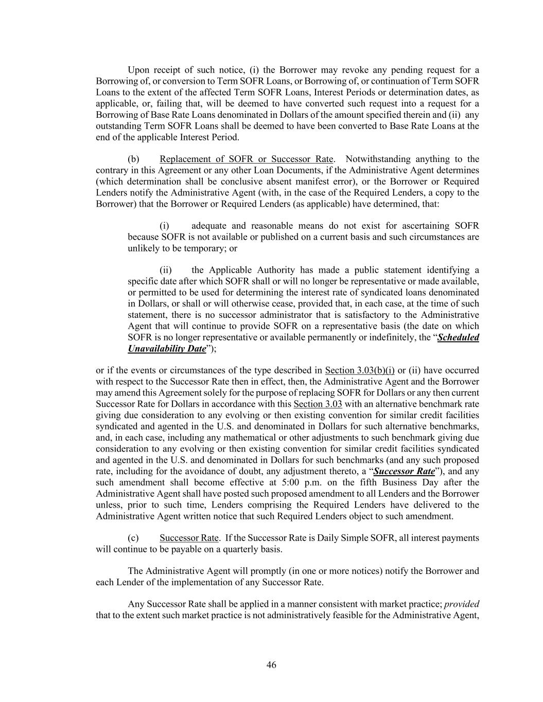 46 Upon receipt of such notice, (i) the Borrower may revoke any pending request for a Borrowing of, or conversion to Term SOFR Loans, or Borrowing of, or continuation of Term SOFR Loans to the extent of the affected Term SOFR Loans, Interest Periods or determination dates, as applicable, or, failing that, will be deemed to have converted such request into a request for a Borrowing of Base Rate Loans denominated in Dollars of the amount specified therein and (ii) any outstanding Term SOFR Loans shall be deemed to have been converted to Base Rate Loans at the end of the applicable Interest Period. (b) Replacement of SOFR or Successor Rate. Notwithstanding anything to the contrary in this Agreement or any other Loan Documents, if the Administrative Agent determines (which determination shall be conclusive absent manifest error), or the Borrower or Required Lenders notify the Administrative Agent (with, in the case of the Required Lenders, a copy to the Borrower) that the Borrower or Required Lenders (as applicable) have determined, that: (i) adequate and reasonable means do not exist for ascertaining SOFR because SOFR is not available or published on a current basis and such circumstances are unlikely to be temporary; or (ii) the Applicable Authority has made a public statement identifying a specific date after which SOFR shall or will no longer be representative or made available, or permitted to be used for determining the interest rate of syndicated loans denominated in Dollars, or shall or will otherwise cease, provided that, in each case, at the time of such statement, there is no successor administrator that is satisfactory to the Administrative Agent that will continue to provide SOFR on a representative basis (the date on which SOFR is no longer representative or available permanently or indefinitely, the “Scheduled Unavailability Date”); or if the events or circumstances of the type described in Section 3.03(b)(i) or (ii) have occurred with respect to the Successor Rate then in effect, then, the Administrative Agent and the Borrower may amend this Agreement solely for the purpose of replacing SOFR for Dollars or any then current Successor Rate for Dollars in accordance with this Section 3.03 with an alternative benchmark rate giving due consideration to any evolving or then existing convention for similar credit facilities syndicated and agented in the U.S. and denominated in Dollars for such alternative benchmarks, and, in each case, including any mathematical or other adjustments to such benchmark giving due consideration to any evolving or then existing convention for similar credit facilities syndicated and agented in the U.S. and denominated in Dollars for such benchmarks (and any such proposed rate, including for the avoidance of doubt, any adjustment thereto, a “Successor Rate”), and any such amendment shall become effective at 5:00 p.m. on the fifth Business Day after the Administrative Agent shall have posted such proposed amendment to all Lenders and the Borrower unless, prior to such time, Lenders comprising the Required Lenders have delivered to the Administrative Agent written notice that such Required Lenders object to such amendment. (c) Successor Rate. If the Successor Rate is Daily Simple SOFR, all interest payments will continue to be payable on a quarterly basis. The Administrative Agent will promptly (in one or more notices) notify the Borrower and each Lender of the implementation of any Successor Rate. Any Successor Rate shall be applied in a manner consistent with market practice; provided that to the extent such market practice is not administratively feasible for the Administrative Agent,