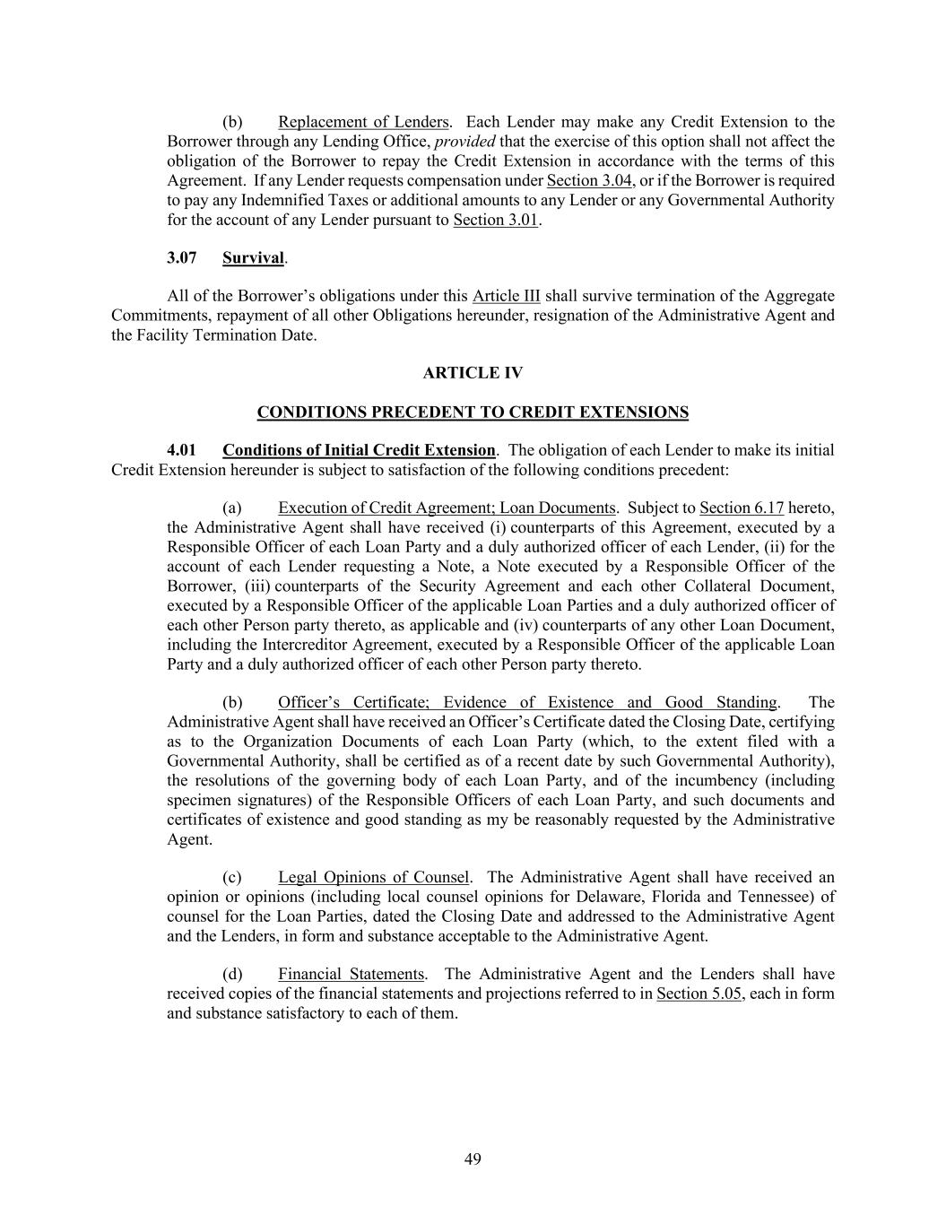 49 (b) Replacement of Lenders. Each Lender may make any Credit Extension to the Borrower through any Lending Office, provided that the exercise of this option shall not affect the obligation of the Borrower to repay the Credit Extension in accordance with the terms of this Agreement. If any Lender requests compensation under Section 3.04, or if the Borrower is required to pay any Indemnified Taxes or additional amounts to any Lender or any Governmental Authority for the account of any Lender pursuant to Section 3.01. 3.07 Survival. All of the Borrower’s obligations under this Article III shall survive termination of the Aggregate Commitments, repayment of all other Obligations hereunder, resignation of the Administrative Agent and the Facility Termination Date. ARTICLE IV CONDITIONS PRECEDENT TO CREDIT EXTENSIONS 4.01 Conditions of Initial Credit Extension. The obligation of each Lender to make its initial Credit Extension hereunder is subject to satisfaction of the following conditions precedent: (a) Execution of Credit Agreement; Loan Documents. Subject to Section 6.17 hereto, the Administrative Agent shall have received (i) counterparts of this Agreement, executed by a Responsible Officer of each Loan Party and a duly authorized officer of each Lender, (ii) for the account of each Lender requesting a Note, a Note executed by a Responsible Officer of the Borrower, (iii) counterparts of the Security Agreement and each other Collateral Document, executed by a Responsible Officer of the applicable Loan Parties and a duly authorized officer of each other Person party thereto, as applicable and (iv) counterparts of any other Loan Document, including the Intercreditor Agreement, executed by a Responsible Officer of the applicable Loan Party and a duly authorized officer of each other Person party thereto. (b) Officer’s Certificate; Evidence of Existence and Good Standing. The Administrative Agent shall have received an Officer’s Certificate dated the Closing Date, certifying as to the Organization Documents of each Loan Party (which, to the extent filed with a Governmental Authority, shall be certified as of a recent date by such Governmental Authority), the resolutions of the governing body of each Loan Party, and of the incumbency (including specimen signatures) of the Responsible Officers of each Loan Party, and such documents and certificates of existence and good standing as my be reasonably requested by the Administrative Agent. (c) Legal Opinions of Counsel. The Administrative Agent shall have received an opinion or opinions (including local counsel opinions for Delaware, Florida and Tennessee) of counsel for the Loan Parties, dated the Closing Date and addressed to the Administrative Agent and the Lenders, in form and substance acceptable to the Administrative Agent. (d) Financial Statements. The Administrative Agent and the Lenders shall have received copies of the financial statements and projections referred to in Section 5.05, each in form and substance satisfactory to each of them.
