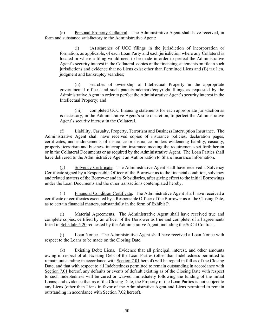 50 (e) Personal Property Collateral. The Administrative Agent shall have received, in form and substance satisfactory to the Administrative Agent: (i) (A) searches of UCC filings in the jurisdiction of incorporation or formation, as applicable, of each Loan Party and each jurisdiction where any Collateral is located or where a filing would need to be made in order to perfect the Administrative Agent’s security interest in the Collateral, copies of the financing statements on file in such jurisdictions and evidence that no Liens exist other than Permitted Liens and (B) tax lien, judgment and bankruptcy searches; (ii) searches of ownership of Intellectual Property in the appropriate governmental offices and such patent/trademark/copyright filings as requested by the Administrative Agent in order to perfect the Administrative Agent’s security interest in the Intellectual Property; and (iii) completed UCC financing statements for each appropriate jurisdiction as is necessary, in the Administrative Agent’s sole discretion, to perfect the Administrative Agent’s security interest in the Collateral. (f) Liability, Casualty, Property, Terrorism and Business Interruption Insurance. The Administrative Agent shall have received copies of insurance policies, declaration pages, certificates, and endorsements of insurance or insurance binders evidencing liability, casualty, property, terrorism and business interruption insurance meeting the requirements set forth herein or in the Collateral Documents or as required by the Administrative Agent. The Loan Parties shall have delivered to the Administrative Agent an Authorization to Share Insurance Information. (g) Solvency Certificate. The Administrative Agent shall have received a Solvency Certificate signed by a Responsible Officer of the Borrower as to the financial condition, solvency and related matters of the Borrower and its Subsidiaries, after giving effect to the initial Borrowings under the Loan Documents and the other transactions contemplated hereby. (h) Financial Condition Certificate. The Administrative Agent shall have received a certificate or certificates executed by a Responsible Officer of the Borrower as of the Closing Date, as to certain financial matters, substantially in the form of Exhibit P. (i) Material Agreements. The Administrative Agent shall have received true and complete copies, certified by an officer of the Borrower as true and complete, of all agreements listed in Schedule 5.20 requested by the Administrative Agent, including the SoCal Contract. (j) Loan Notice. The Administrative Agent shall have received a Loan Notice with respect to the Loans to be made on the Closing Date. (k) Existing Debt; Liens. Evidence that all principal, interest, and other amounts owing in respect of all Existing Debt of the Loan Parties (other than Indebtedness permitted to remain outstanding in accordance with Section 7.01 hereof) will be repaid in full as of the Closing Date, and that with respect to all Indebtedness permitted to remain outstanding in accordance with Section 7.01 hereof, any defaults or events of default existing as of the Closing Date with respect to such Indebtedness will be cured or waived immediately following the funding of the initial Loans; and evidence that as of the Closing Date, the Property of the Loan Parties is not subject to any Liens (other than Liens in favor of the Administrative Agent and Liens permitted to remain outstanding in accordance with Section 7.02 hereof).
