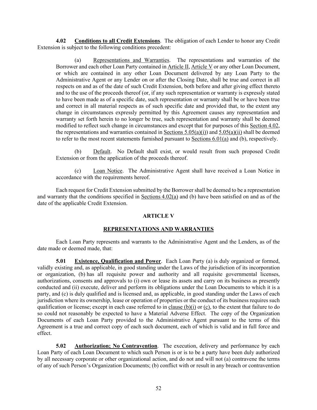 52 4.02 Conditions to all Credit Extensions. The obligation of each Lender to honor any Credit Extension is subject to the following conditions precedent: (a) Representations and Warranties. The representations and warranties of the Borrower and each other Loan Party contained in Article II, Article V or any other Loan Document, or which are contained in any other Loan Document delivered by any Loan Party to the Administrative Agent or any Lender on or after the Closing Date, shall be true and correct in all respects on and as of the date of such Credit Extension, both before and after giving effect thereto and to the use of the proceeds thereof (or, if any such representation or warranty is expressly stated to have been made as of a specific date, such representation or warranty shall be or have been true and correct in all material respects as of such specific date and provided that, to the extent any change in circumstances expressly permitted by this Agreement causes any representation and warranty set forth herein to no longer be true, such representation and warranty shall be deemed modified to reflect such change in circumstances and except that for purposes of this Section 4.02, the representations and warranties contained in Sections 5.05(a)(i)) and 5.05(a)(ii) shall be deemed to refer to the most recent statements furnished pursuant to Sections 6.01(a) and (b), respectively. (b) Default. No Default shall exist, or would result from such proposed Credit Extension or from the application of the proceeds thereof. (c) Loan Notice. The Administrative Agent shall have received a Loan Notice in accordance with the requirements hereof. Each request for Credit Extension submitted by the Borrower shall be deemed to be a representation and warranty that the conditions specified in Sections 4.02(a) and (b) have been satisfied on and as of the date of the applicable Credit Extension. ARTICLE V REPRESENTATIONS AND WARRANTIES Each Loan Party represents and warrants to the Administrative Agent and the Lenders, as of the date made or deemed made, that: 5.01 Existence, Qualification and Power. Each Loan Party (a) is duly organized or formed, validly existing and, as applicable, in good standing under the Laws of the jurisdiction of its incorporation or organization, (b) has all requisite power and authority and all requisite governmental licenses, authorizations, consents and approvals to (i) own or lease its assets and carry on its business as presently conducted and (ii) execute, deliver and perform its obligations under the Loan Documents to which it is a party, and (c) is duly qualified and is licensed and, as applicable, in good standing under the Laws of each jurisdiction where its ownership, lease or operation of properties or the conduct of its business requires such qualification or license; except in each case referred to in clause (b)(i) or (c), to the extent that failure to do so could not reasonably be expected to have a Material Adverse Effect. The copy of the Organization Documents of each Loan Party provided to the Administrative Agent pursuant to the terms of this Agreement is a true and correct copy of each such document, each of which is valid and in full force and effect. 5.02 Authorization; No Contravention. The execution, delivery and performance by each Loan Party of each Loan Document to which such Person is or is to be a party have been duly authorized by all necessary corporate or other organizational action, and do not and will not (a) contravene the terms of any of such Person’s Organization Documents; (b) conflict with or result in any breach or contravention