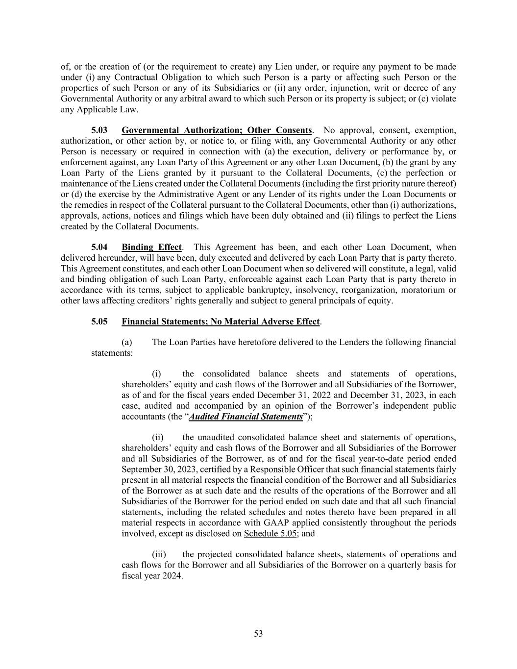 53 of, or the creation of (or the requirement to create) any Lien under, or require any payment to be made under (i) any Contractual Obligation to which such Person is a party or affecting such Person or the properties of such Person or any of its Subsidiaries or (ii) any order, injunction, writ or decree of any Governmental Authority or any arbitral award to which such Person or its property is subject; or (c) violate any Applicable Law. 5.03 Governmental Authorization; Other Consents. No approval, consent, exemption, authorization, or other action by, or notice to, or filing with, any Governmental Authority or any other Person is necessary or required in connection with (a) the execution, delivery or performance by, or enforcement against, any Loan Party of this Agreement or any other Loan Document, (b) the grant by any Loan Party of the Liens granted by it pursuant to the Collateral Documents, (c) the perfection or maintenance of the Liens created under the Collateral Documents (including the first priority nature thereof) or (d) the exercise by the Administrative Agent or any Lender of its rights under the Loan Documents or the remedies in respect of the Collateral pursuant to the Collateral Documents, other than (i) authorizations, approvals, actions, notices and filings which have been duly obtained and (ii) filings to perfect the Liens created by the Collateral Documents. 5.04 Binding Effect. This Agreement has been, and each other Loan Document, when delivered hereunder, will have been, duly executed and delivered by each Loan Party that is party thereto. This Agreement constitutes, and each other Loan Document when so delivered will constitute, a legal, valid and binding obligation of such Loan Party, enforceable against each Loan Party that is party thereto in accordance with its terms, subject to applicable bankruptcy, insolvency, reorganization, moratorium or other laws affecting creditors’ rights generally and subject to general principals of equity. 5.05 Financial Statements; No Material Adverse Effect. (a) The Loan Parties have heretofore delivered to the Lenders the following financial statements: (i) the consolidated balance sheets and statements of operations, shareholders’ equity and cash flows of the Borrower and all Subsidiaries of the Borrower, as of and for the fiscal years ended December 31, 2022 and December 31, 2023, in each case, audited and accompanied by an opinion of the Borrower’s independent public accountants (the “Audited Financial Statements”); (ii) the unaudited consolidated balance sheet and statements of operations, shareholders’ equity and cash flows of the Borrower and all Subsidiaries of the Borrower and all Subsidiaries of the Borrower, as of and for the fiscal year-to-date period ended September 30, 2023, certified by a Responsible Officer that such financial statements fairly present in all material respects the financial condition of the Borrower and all Subsidiaries of the Borrower as at such date and the results of the operations of the Borrower and all Subsidiaries of the Borrower for the period ended on such date and that all such financial statements, including the related schedules and notes thereto have been prepared in all material respects in accordance with GAAP applied consistently throughout the periods involved, except as disclosed on Schedule 5.05; and (iii) the projected consolidated balance sheets, statements of operations and cash flows for the Borrower and all Subsidiaries of the Borrower on a quarterly basis for fiscal year 2024.