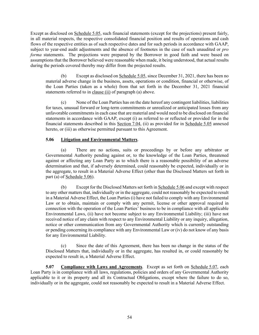 54 Except as disclosed on Schedule 5.05, such financial statements (except for the projections) present fairly, in all material respects, the respective consolidated financial position and results of operations and cash flows of the respective entities as of such respective dates and for such periods in accordance with GAAP, subject to year-end audit adjustments and the absence of footnotes in the case of such unaudited or pro forma statements. The projections were prepared by the Borrower in good faith and were based on assumptions that the Borrower believed were reasonable when made, it being understood, that actual results during the periods covered thereby may differ from the projected results. (b) Except as disclosed on Schedule 5.05, since December 31, 2021, there has been no material adverse change in the business, assets, operations or condition, financial or otherwise, of the Loan Parties (taken as a whole) from that set forth in the December 31, 2021 financial statements referred to in clause (ii) of paragraph (a) above. (c) None of the Loan Parties has on the date hereof any contingent liabilities, liabilities for taxes, unusual forward or long-term commitments or unrealized or anticipated losses from any unfavorable commitments in each case that are material and would need to be disclosed on financial statements in accordance with GAAP, except (i) as referred to or reflected or provided for in the financial statements described in this Section 7.04, (ii) as provided for in Schedule 5.05 annexed hereto, or (iii) as otherwise permitted pursuant to this Agreement. 5.06 Litigation and Environmental Matters. (a) There are no actions, suits or proceedings by or before any arbitrator or Governmental Authority pending against or, to the knowledge of the Loan Parties, threatened against or affecting any Loan Party as to which there is a reasonable possibility of an adverse determination and that, if adversely determined, could reasonably be expected, individually or in the aggregate, to result in a Material Adverse Effect (other than the Disclosed Matters set forth in part (a) of Schedule 5.06). (b) Except for the Disclosed Matters set forth in Schedule 5.06 and except with respect to any other matters that, individually or in the aggregate, could not reasonably be expected to result in a Material Adverse Effect, the Loan Parties (i) have not failed to comply with any Environmental Law or to obtain, maintain or comply with any permit, license or other approval required in connection with the operation of the Loan Parties’ business to be in compliance with all applicable Environmental Laws, (ii) have not become subject to any Environmental Liability; (iii) have not received notice of any claim with respect to any Environmental Liability or any inquiry, allegation, notice or other communication from any Governmental Authority which is currently outstanding or pending concerning its compliance with any Environmental Law or (iv) do not know of any basis for any Environmental Liability. (c) Since the date of this Agreement, there has been no change in the status of the Disclosed Matters that, individually or in the aggregate, has resulted in, or could reasonably be expected to result in, a Material Adverse Effect. 5.07 Compliance with Laws and Agreements. Except as set forth on Schedule 5.07, each Loan Party is in compliance with all laws, regulations, policies and orders of any Governmental Authority applicable to it or its property and all its Contractual Obligations, except where the failure to do so, individually or in the aggregate, could not reasonably be expected to result in a Material Adverse Effect.