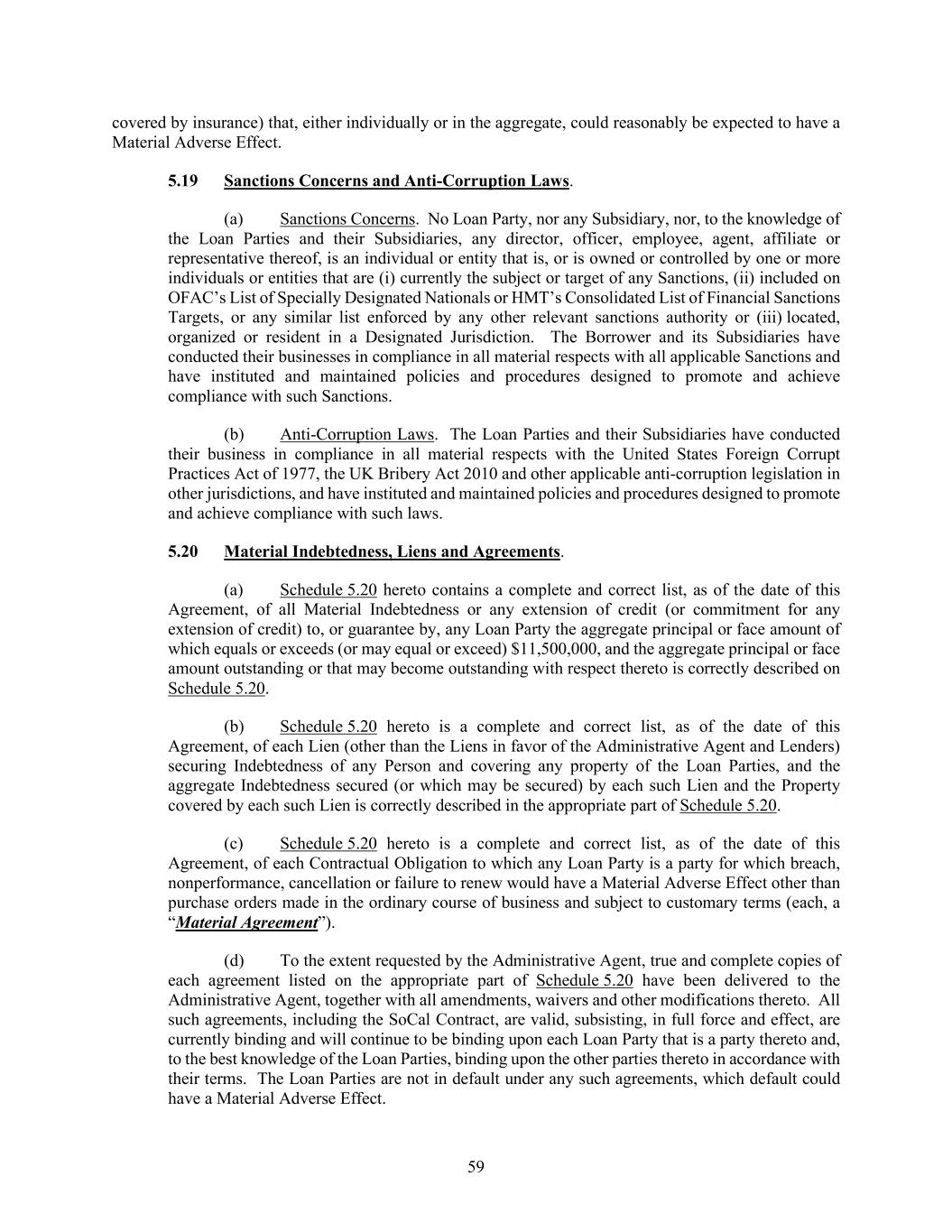 59 covered by insurance) that, either individually or in the aggregate, could reasonably be expected to have a Material Adverse Effect. 5.19 Sanctions Concerns and Anti-Corruption Laws. (a) Sanctions Concerns. No Loan Party, nor any Subsidiary, nor, to the knowledge of the Loan Parties and their Subsidiaries, any director, officer, employee, agent, affiliate or representative thereof, is an individual or entity that is, or is owned or controlled by one or more individuals or entities that are (i) currently the subject or target of any Sanctions, (ii) included on OFAC’s List of Specially Designated Nationals or HMT’s Consolidated List of Financial Sanctions Targets, or any similar list enforced by any other relevant sanctions authority or (iii) located, organized or resident in a Designated Jurisdiction. The Borrower and its Subsidiaries have conducted their businesses in compliance in all material respects with all applicable Sanctions and have instituted and maintained policies and procedures designed to promote and achieve compliance with such Sanctions. (b) Anti-Corruption Laws. The Loan Parties and their Subsidiaries have conducted their business in compliance in all material respects with the United States Foreign Corrupt Practices Act of 1977, the UK Bribery Act 2010 and other applicable anti-corruption legislation in other jurisdictions, and have instituted and maintained policies and procedures designed to promote and achieve compliance with such laws. 5.20 Material Indebtedness, Liens and Agreements. (a) Schedule 5.20 hereto contains a complete and correct list, as of the date of this Agreement, of all Material Indebtedness or any extension of credit (or commitment for any extension of credit) to, or guarantee by, any Loan Party the aggregate principal or face amount of which equals or exceeds (or may equal or exceed) $11,500,000, and the aggregate principal or face amount outstanding or that may become outstanding with respect thereto is correctly described on Schedule 5.20. (b) Schedule 5.20 hereto is a complete and correct list, as of the date of this Agreement, of each Lien (other than the Liens in favor of the Administrative Agent and Lenders) securing Indebtedness of any Person and covering any property of the Loan Parties, and the aggregate Indebtedness secured (or which may be secured) by each such Lien and the Property covered by each such Lien is correctly described in the appropriate part of Schedule 5.20. (c) Schedule 5.20 hereto is a complete and correct list, as of the date of this Agreement, of each Contractual Obligation to which any Loan Party is a party for which breach, nonperformance, cancellation or failure to renew would have a Material Adverse Effect other than purchase orders made in the ordinary course of business and subject to customary terms (each, a “Material Agreement”). (d) To the extent requested by the Administrative Agent, true and complete copies of each agreement listed on the appropriate part of Schedule 5.20 have been delivered to the Administrative Agent, together with all amendments, waivers and other modifications thereto. All such agreements, including the SoCal Contract, are valid, subsisting, in full force and effect, are currently binding and will continue to be binding upon each Loan Party that is a party thereto and, to the best knowledge of the Loan Parties, binding upon the other parties thereto in accordance with their terms. The Loan Parties are not in default under any such agreements, which default could have a Material Adverse Effect.