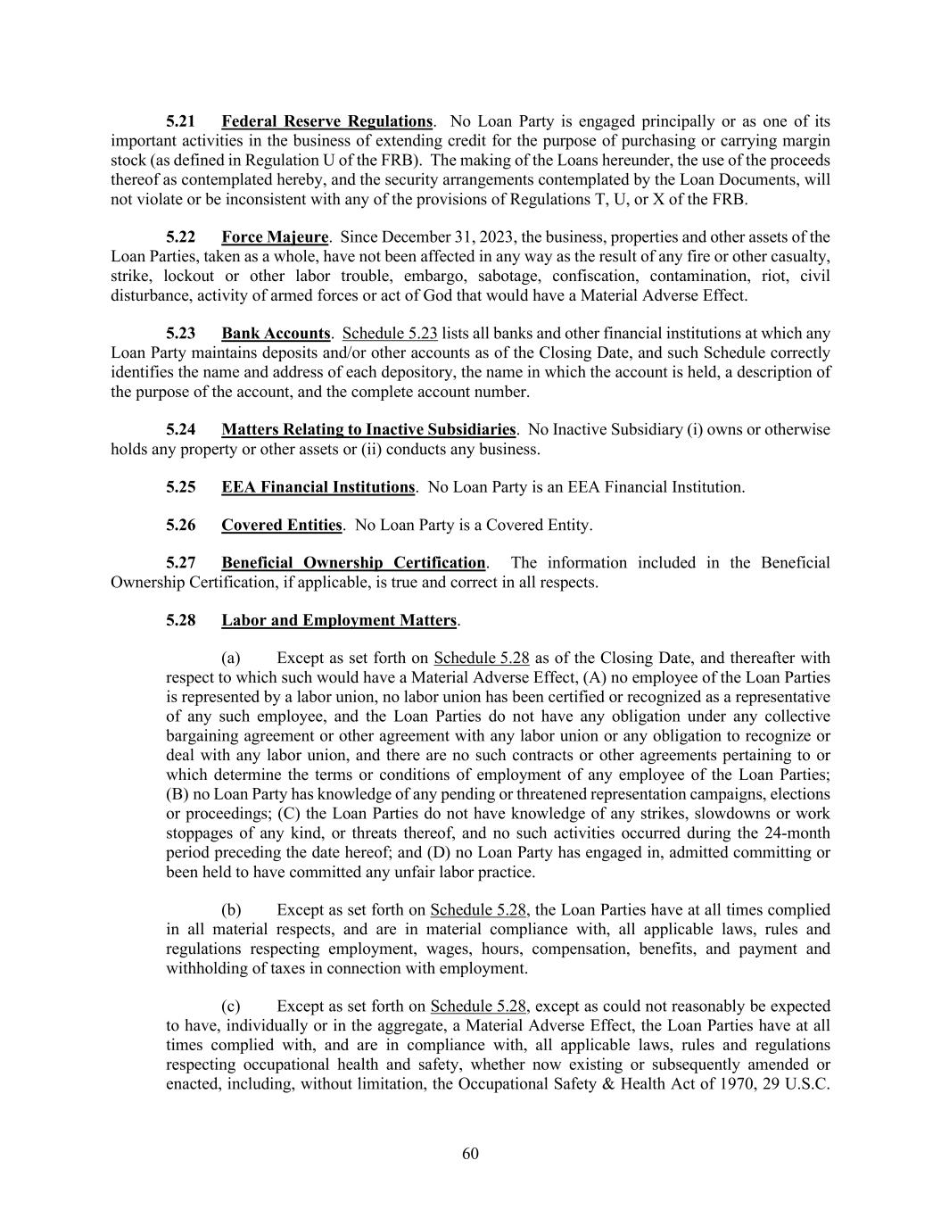 60 5.21 Federal Reserve Regulations. No Loan Party is engaged principally or as one of its important activities in the business of extending credit for the purpose of purchasing or carrying margin stock (as defined in Regulation U of the FRB). The making of the Loans hereunder, the use of the proceeds thereof as contemplated hereby, and the security arrangements contemplated by the Loan Documents, will not violate or be inconsistent with any of the provisions of Regulations T, U, or X of the FRB. 5.22 Force Majeure. Since December 31, 2023, the business, properties and other assets of the Loan Parties, taken as a whole, have not been affected in any way as the result of any fire or other casualty, strike, lockout or other labor trouble, embargo, sabotage, confiscation, contamination, riot, civil disturbance, activity of armed forces or act of God that would have a Material Adverse Effect. 5.23 Bank Accounts. Schedule 5.23 lists all banks and other financial institutions at which any Loan Party maintains deposits and/or other accounts as of the Closing Date, and such Schedule correctly identifies the name and address of each depository, the name in which the account is held, a description of the purpose of the account, and the complete account number. 5.24 Matters Relating to Inactive Subsidiaries. No Inactive Subsidiary (i) owns or otherwise holds any property or other assets or (ii) conducts any business. 5.25 EEA Financial Institutions. No Loan Party is an EEA Financial Institution. 5.26 Covered Entities. No Loan Party is a Covered Entity. 5.27 Beneficial Ownership Certification. The information included in the Beneficial Ownership Certification, if applicable, is true and correct in all respects. 5.28 Labor and Employment Matters. (a) Except as set forth on Schedule 5.28 as of the Closing Date, and thereafter with respect to which such would have a Material Adverse Effect, (A) no employee of the Loan Parties is represented by a labor union, no labor union has been certified or recognized as a representative of any such employee, and the Loan Parties do not have any obligation under any collective bargaining agreement or other agreement with any labor union or any obligation to recognize or deal with any labor union, and there are no such contracts or other agreements pertaining to or which determine the terms or conditions of employment of any employee of the Loan Parties; (B) no Loan Party has knowledge of any pending or threatened representation campaigns, elections or proceedings; (C) the Loan Parties do not have knowledge of any strikes, slowdowns or work stoppages of any kind, or threats thereof, and no such activities occurred during the 24-month period preceding the date hereof; and (D) no Loan Party has engaged in, admitted committing or been held to have committed any unfair labor practice. (b) Except as set forth on Schedule 5.28, the Loan Parties have at all times complied in all material respects, and are in material compliance with, all applicable laws, rules and regulations respecting employment, wages, hours, compensation, benefits, and payment and withholding of taxes in connection with employment. (c) Except as set forth on Schedule 5.28, except as could not reasonably be expected to have, individually or in the aggregate, a Material Adverse Effect, the Loan Parties have at all times complied with, and are in compliance with, all applicable laws, rules and regulations respecting occupational health and safety, whether now existing or subsequently amended or enacted, including, without limitation, the Occupational Safety & Health Act of 1970, 29 U.S.C.